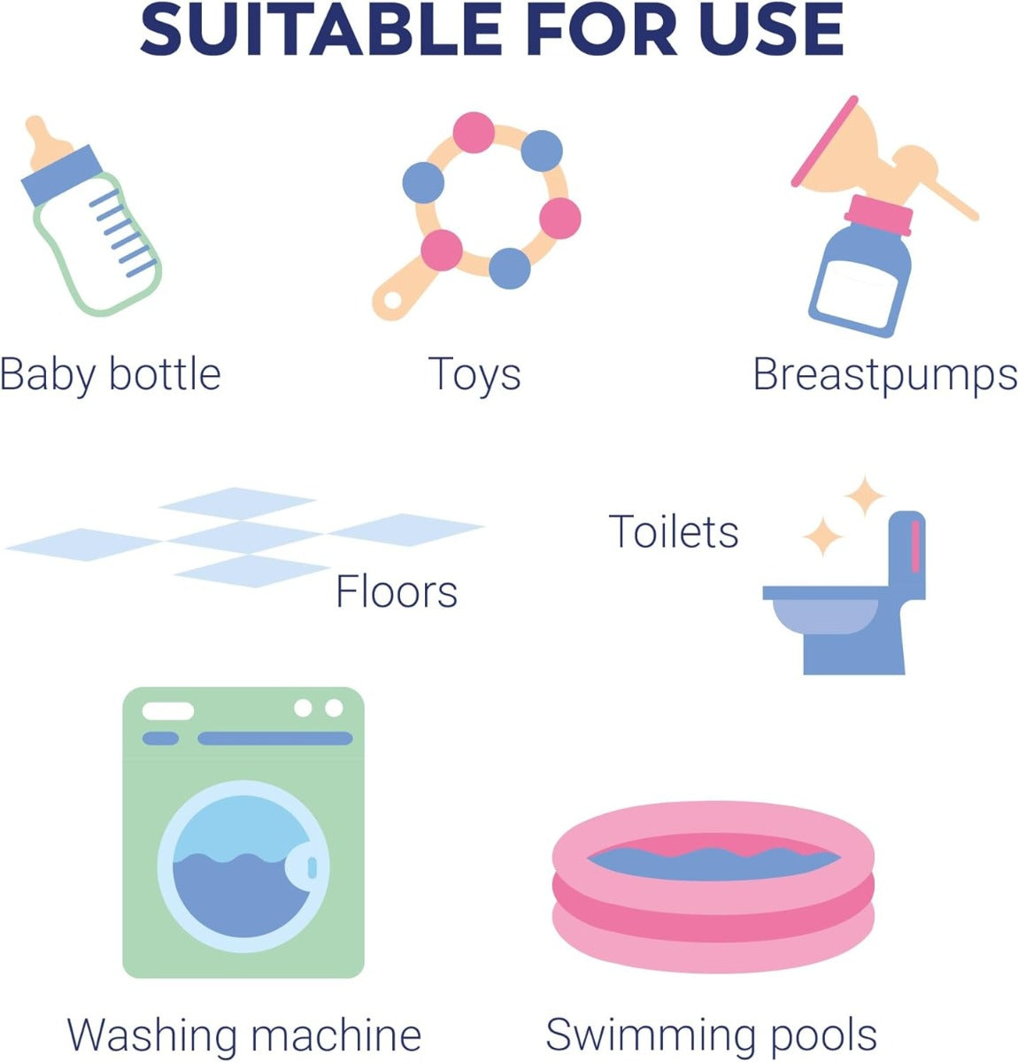 The Milton Steriliser Tablets also eliminate the risk of cross-contamination. While many products require you to rinse equipment upon removal, bacteria on tea towels and surfaces can erase your careful work. However, this Milton Sterilising solution is perfectly safe for babies' little mouths. Now you can simply remove that teether or soother and return it swiftly for a safe, happy baby – and your own peace of mind.
