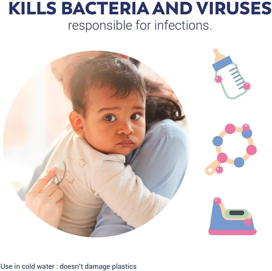 - Solution works for 24 hours: you can sterilise baby’s feeding equipment again and again for 24 hours