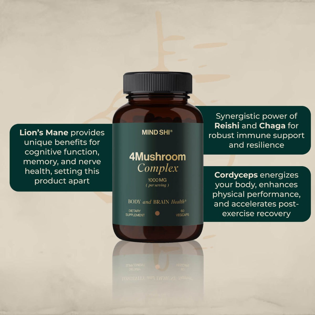At Mind Shi, we are dedicated to delivering high-quality, organic, vegan, and non-GMO supplements. Our 4Mushroom Complex combines Lion’s Mane, Cordyceps, Chaga, and Reishi to enhance cognitive function, boost energy, strengthen immunity, and promote overall balance. We prioritize clean ingredients and rigorous quality standards, so you can trust that you're getting a supplement that truly supports brain health, endurance, immune defense, and stress management.