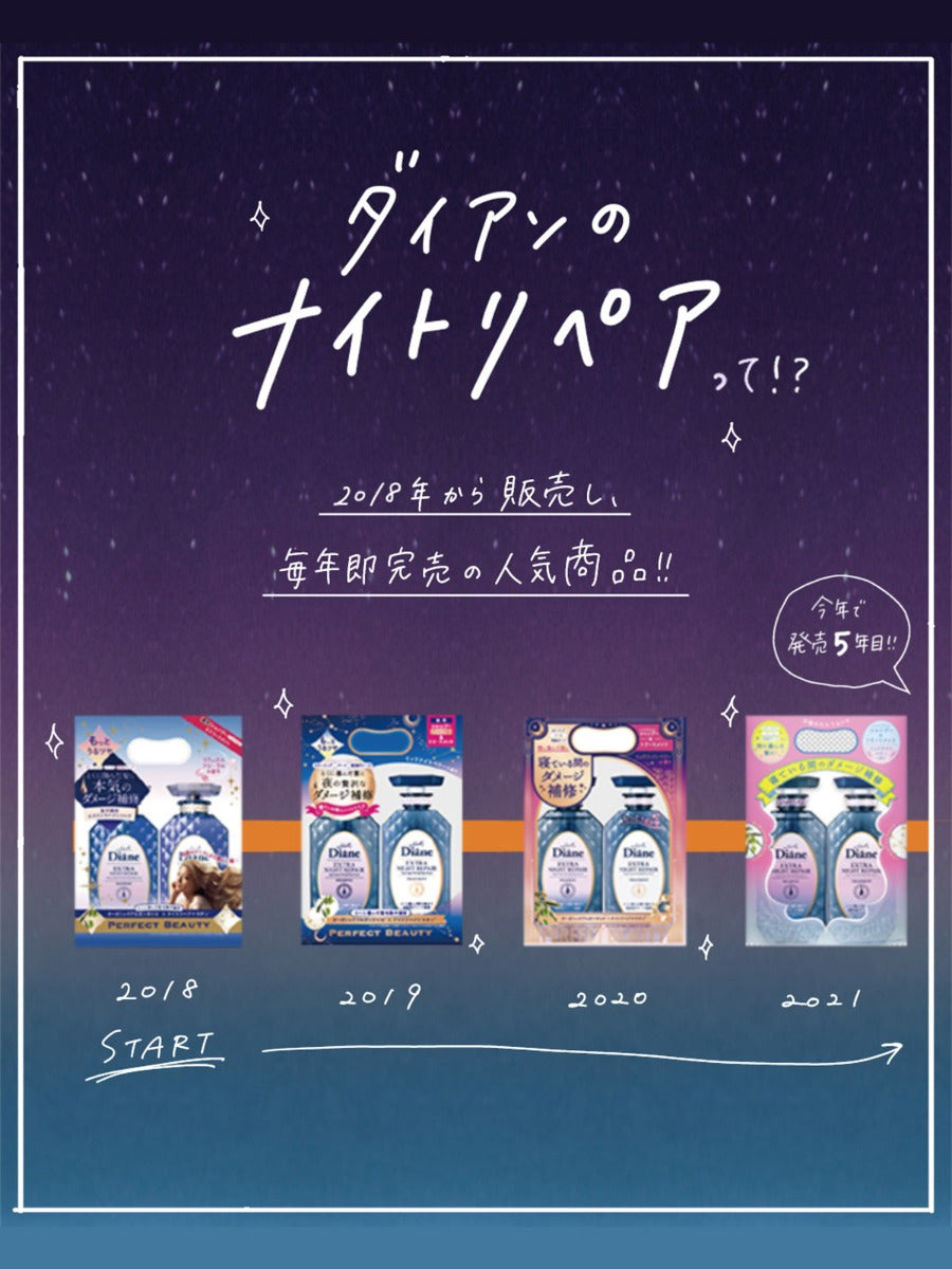 Moist Diane Extra Night Repair Shampoo + Treatment Set is designed ot intensively repair hair overnight. It is formulated with Silk Amino Acid1 and Vitamin E Capsules* to deeply repair damaged holes in normal to dry hair overnight. While working the treatment into wet hair, Vitamin E capsules coat each hair strand to penetrate through hair cuticles into the deepest layers, nourishing the hair from within. Vitamin E is an antioxidant known to protect hair from damage, making it more resistant to further stress from heat and chemical treatments. Infused with calming notes of white florals and sweet berries to create a soothing atmosphere for a tranquil night’s rest.