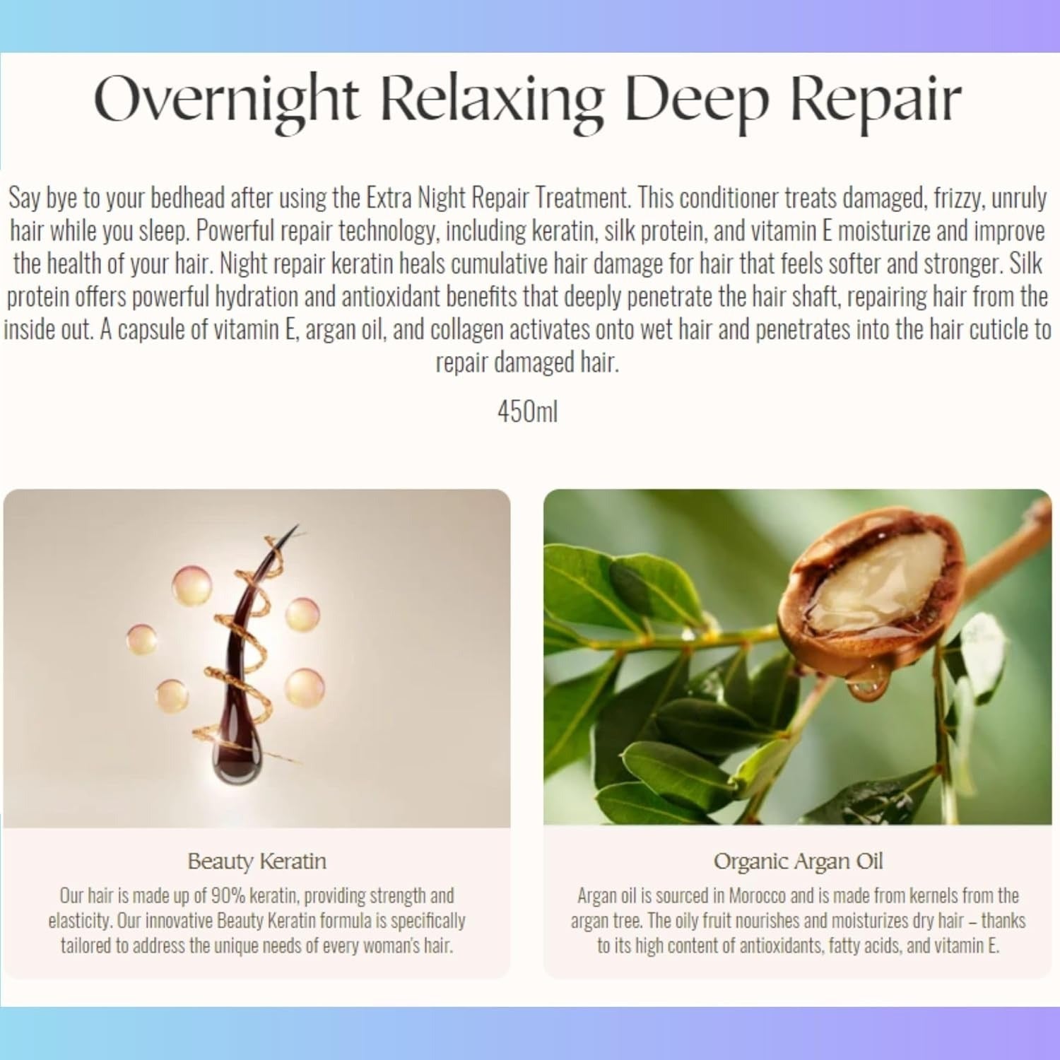 Tossing and turning during sleep can cause hair tangling and loss of volume. Night repair haircare products nourish and repair your hair, keeping it healthy and looking great by morning.