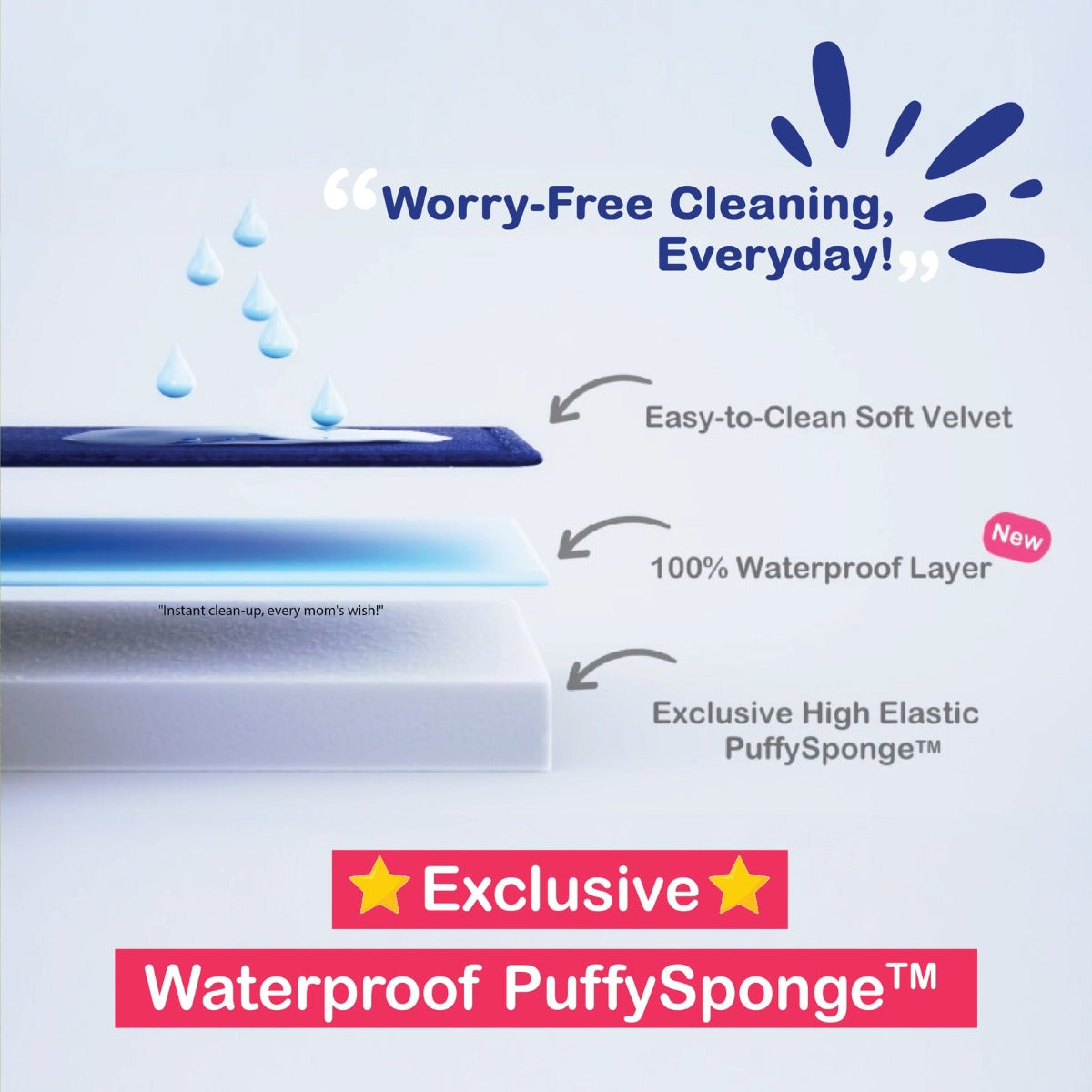 PuffySponge™ formula, now boasting a 100% Waterproof feature. No More Worries for any "Oops" moments from our Playful Toddlers and Lovely Pets!
