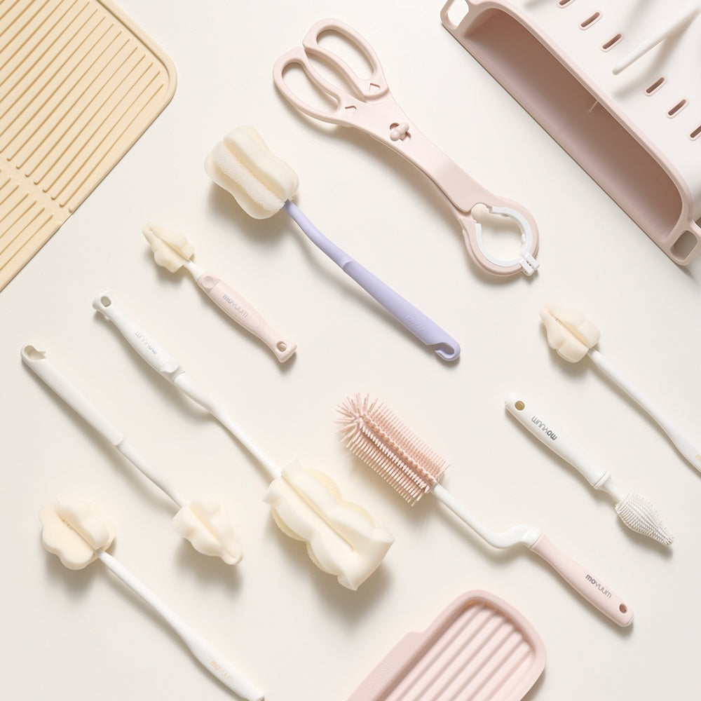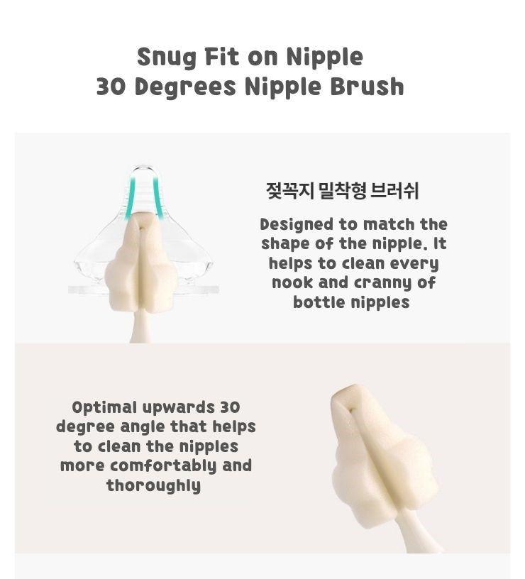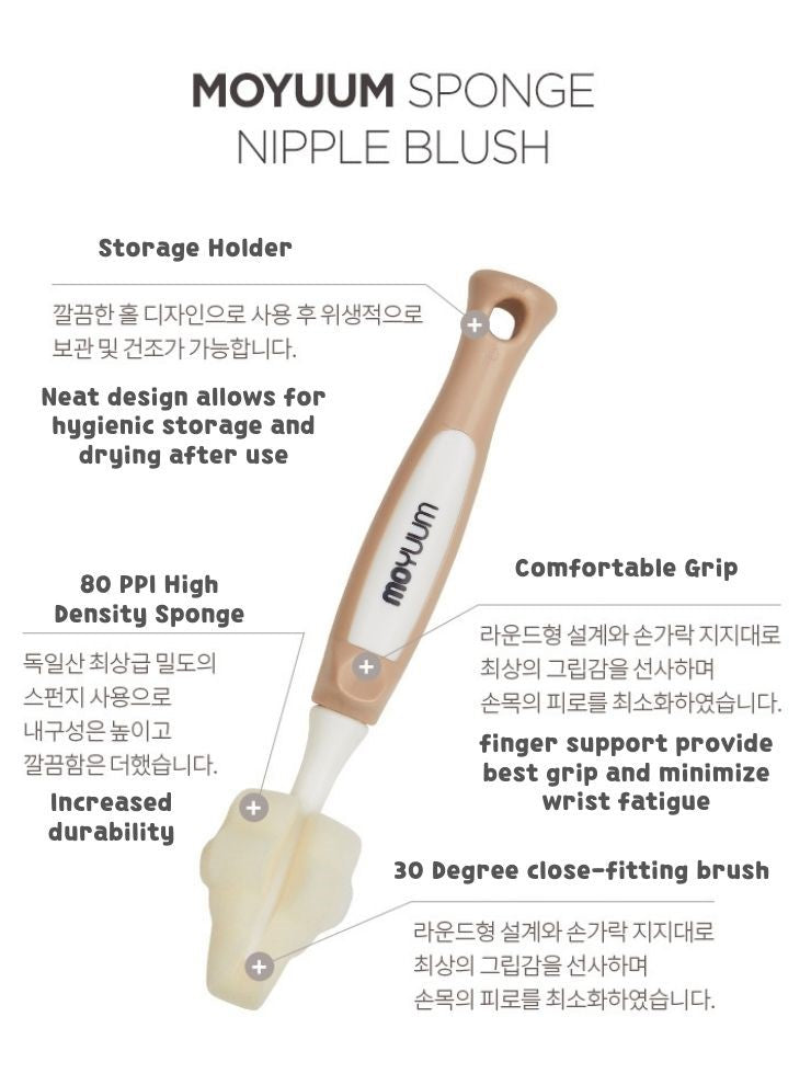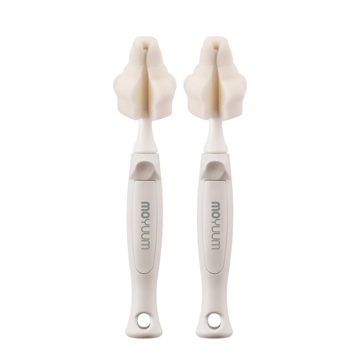 Moyuum Sponge Nipple Brush i s a pack of 2 cleaning sponge brushes designed to reach every nook and cranny of your bottle nipples. These brushes are comfortable to hold, and made of 80PPI high-density sponge. With an optimal 30 degrees angle, it also prevents wrist fatigue.