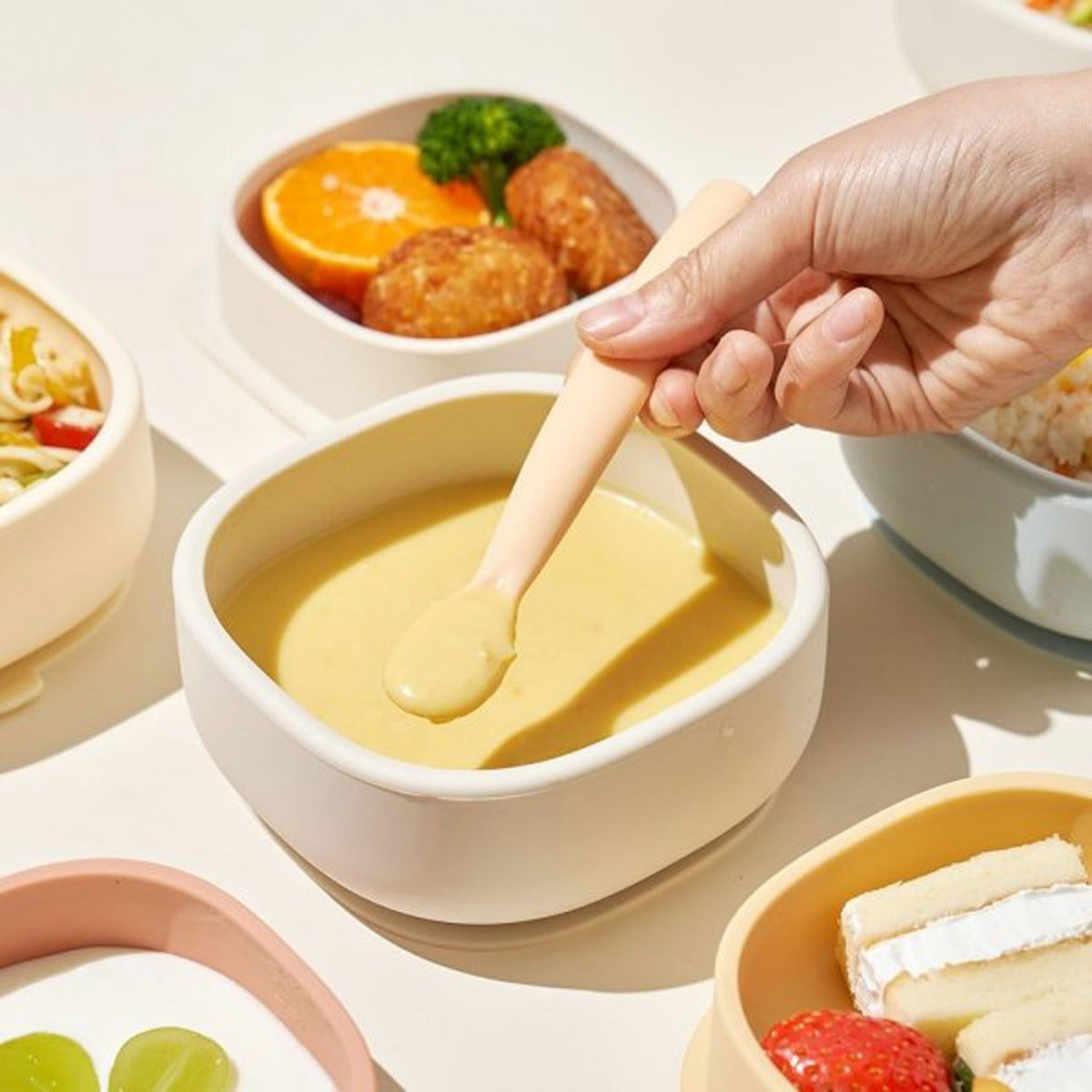 Moyuum Silicone Suction Bowl with Lid is an award-winning design silicone baby bowl that is capable of super-strong suction thanks to its wide and heavy suction bae. Designed with inner rounded corners, this bowl makes scooping food easier and minimizes spillage. It also comes with a silicone lid that is about 3cm deep, which doubles up as another plate for babies such as for snacks! The usability is enhanced with a detailed scale of volume, and this silicone material can be sterilized with hot water, so it can be used more hygienically.Β Β