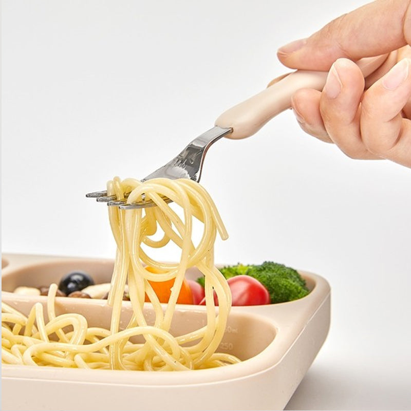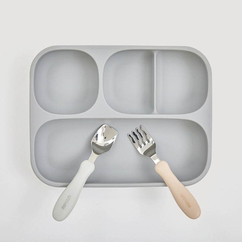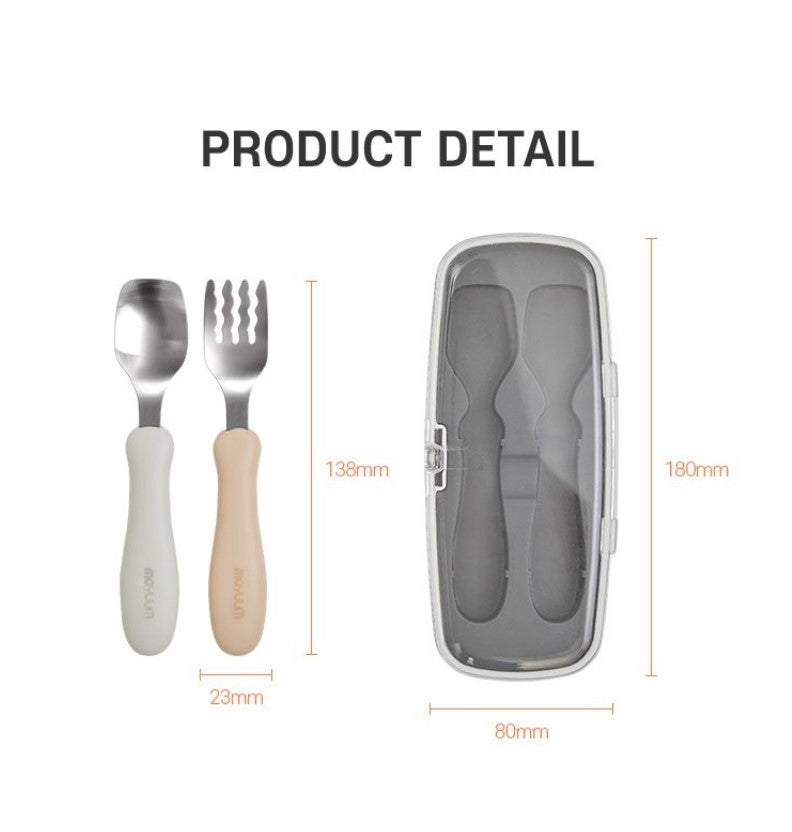 Moyuum Stainless Steel Baby Spoon and Fork Set with Travel Case is a set of stainless steel baby spoon and fork set that has a silicone handle to ensure good grip which is perfect for babies learning to self-feed. Level up your toddler's mealtime game with Moyuum ergonomically designed spoon and fork set that fit perfectly to their hands and mouth. We have your Toddler’s mealtime needs to be covered! Featuring a straight spoon head and a zig-zag groove design on the fork which allows for easy gripping of food. The travel case keeps utensils clean especially while on the go.
