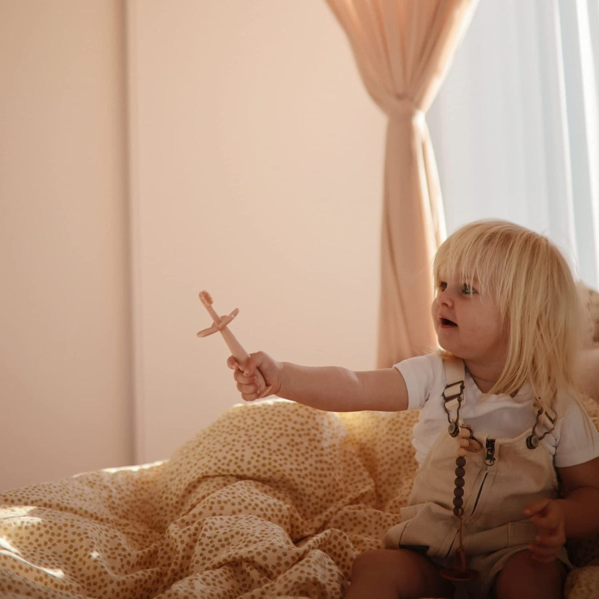 Mushie Baby Flower Training Toothbrush is a 100% food-grade silicone baby toothbrush, designed with super soft bristles that gently clean and stimulate your little one's gums and teeth Introduce your little one to brushing independently while building good habits with our playfully-designed toothbrush. Featuring a silicone suction base for convenience and a removable safety guard to prevent gagging and choking. Available in beautiful soft modern colours.