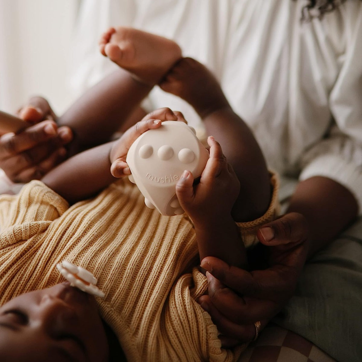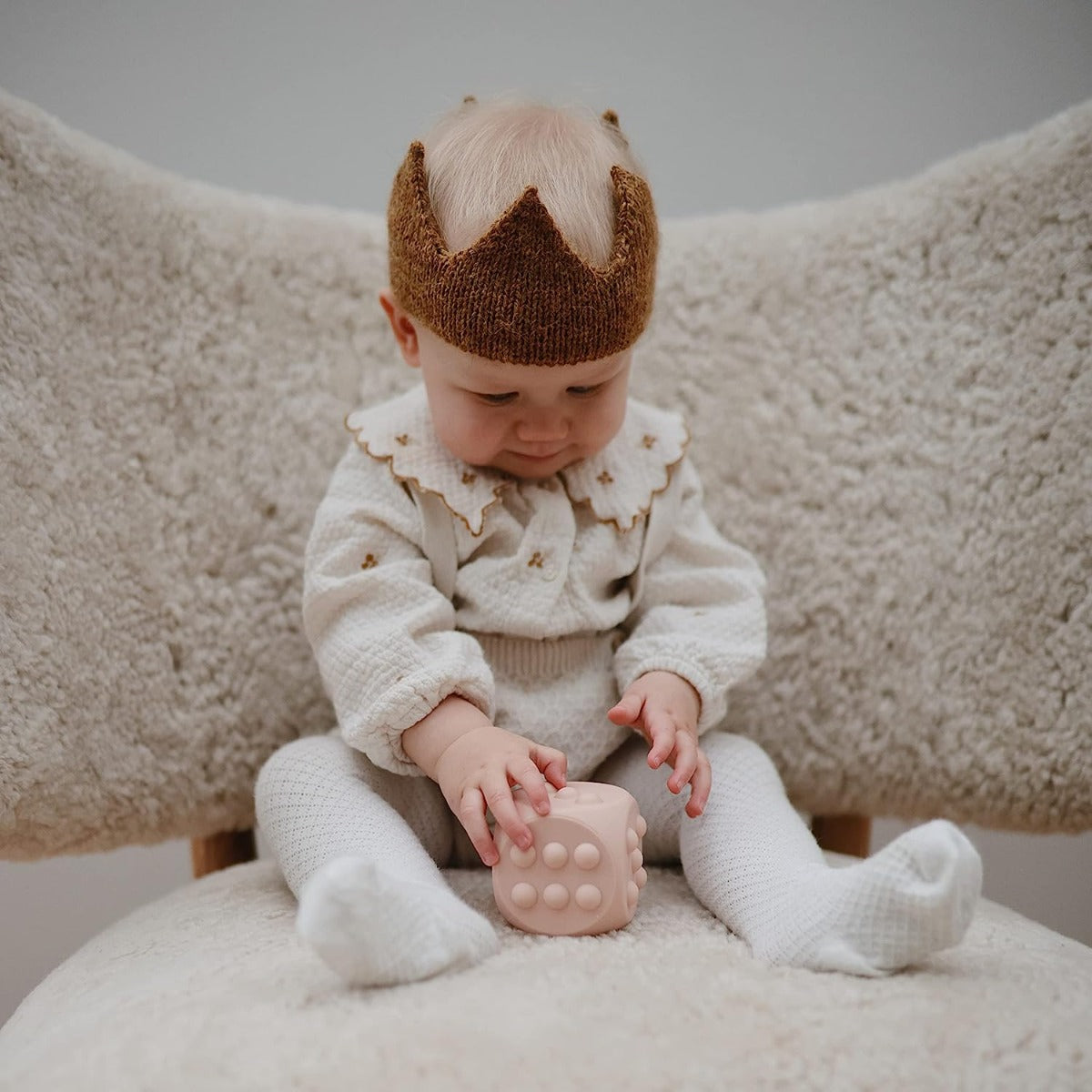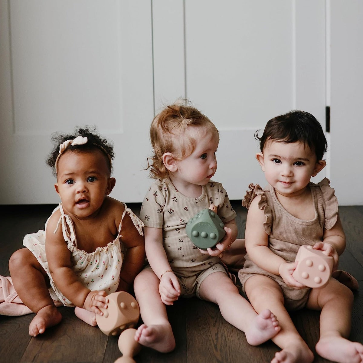 Mushie Dice Press Toy is a pair of dice that features poppable dots on each face, encouraging fine motor skill development while also providing a tool for teaching counting and simple arithmetic. A sensory toy and STEM toy all in one, this set of two was developed to keep little hands and minds busy. Combine learning and play with the mushie Dice Press Toy. Made with 100% food-grade silicone.