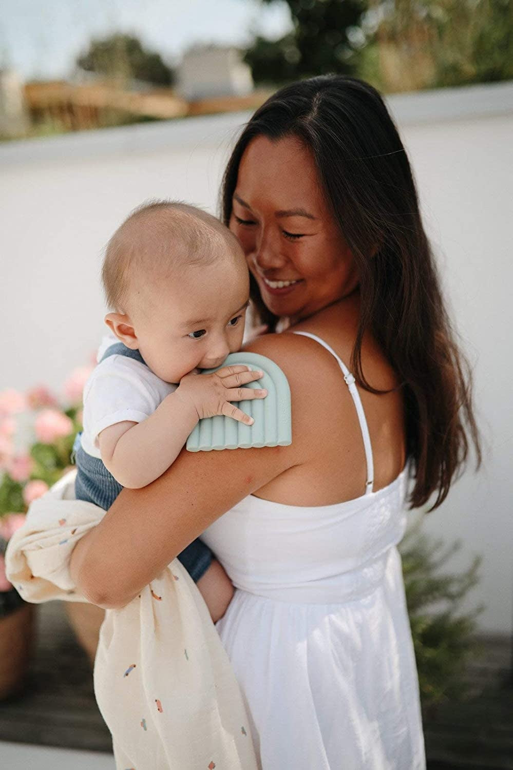 Mushie Silicone Rainbow Teether is a teether shaped like a rainbow made from 100% non-toxic, food-grade silicone that helps soothe your baby's irritated gums. Designed to be easy to grasp by tiny fingers, our teether balls are safe for your baby to use. Their playful design and sophisticated colors make them a stylish addition to your home.