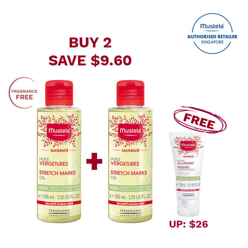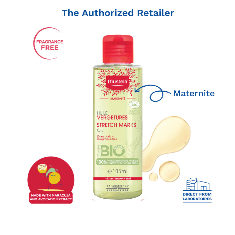 Mustela Stretch Marks Oil is a fragrance-free product specifically formulated with only 4 ingredients of natural origin, to help limit the appearance of stretch marks during pregnancy and postpartum by delivering hydration to the skin: