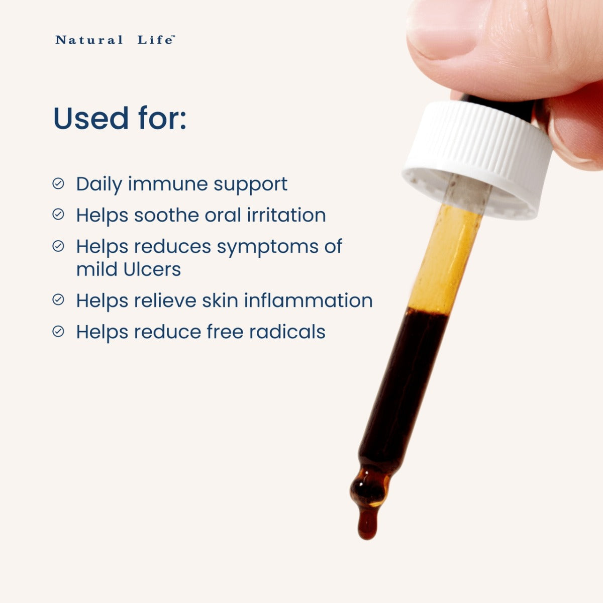 Natural Life Propolis Double Strength Liquid Drops (40%) serve to help soothe oral irritation & reduce symptoms of mild mouth ulcers. The powerful antioxidants within Propolis such as bio-flavonoids and quercetin combine to help support your immune health and reduce free radicals formed in the body. This health expert approved formula is the result of years of expertise and innovation—designed to provide you with nothing less than the best. When it comes to quality, time tells the true story. For over three decades, our Propolis Liquid has been trusted for its quality and effectiveness.