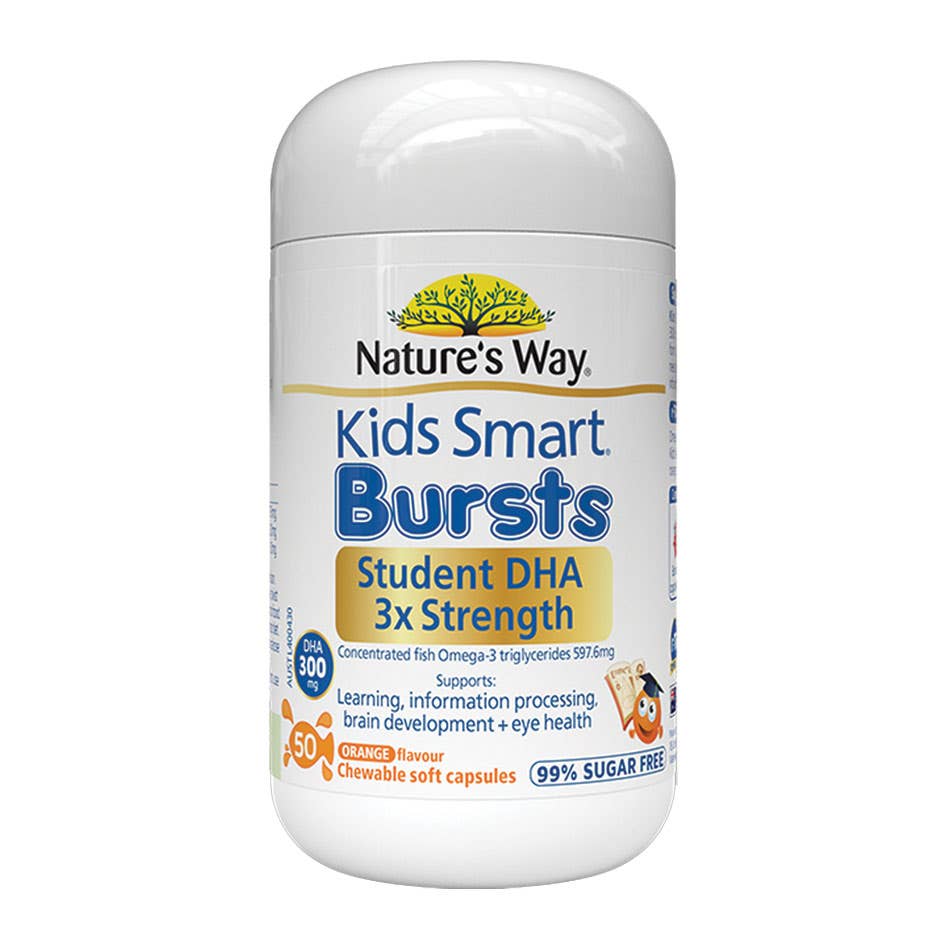 Nature's Way Kids Smart Bursts Student DHA 300mg Triple Strength contains a high dose of DHA for kids in a great-tasting chewable burstlet. DHA 300mg is an essential fatty acid your child needs to support learning, cognitive performance and information processing when dietary intake is inadequate.* Omega-3 is an essential nutrient that supports brain development, eye health and nervous system health.