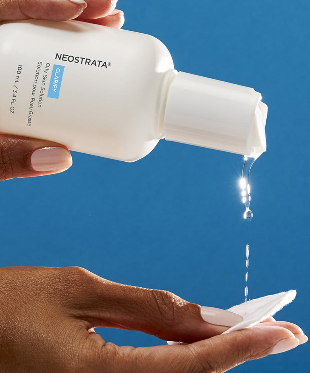 Neostrata Clarify Oily Skin SolutionΒ is a toner solution that contains Glycolic Acid, an Alpha Hydroxy Acid (AHA), to gently exfoliate, help clear clogged pores and remove excess surface oil, sebum and other lipids present on blemish-prone skin.