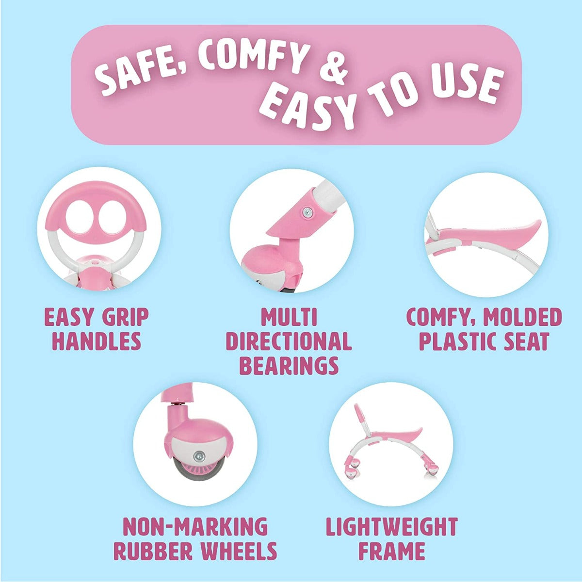 - For riding, pushing, sitting, and supported walking; this versatile design accommodates your child’s developmental stages