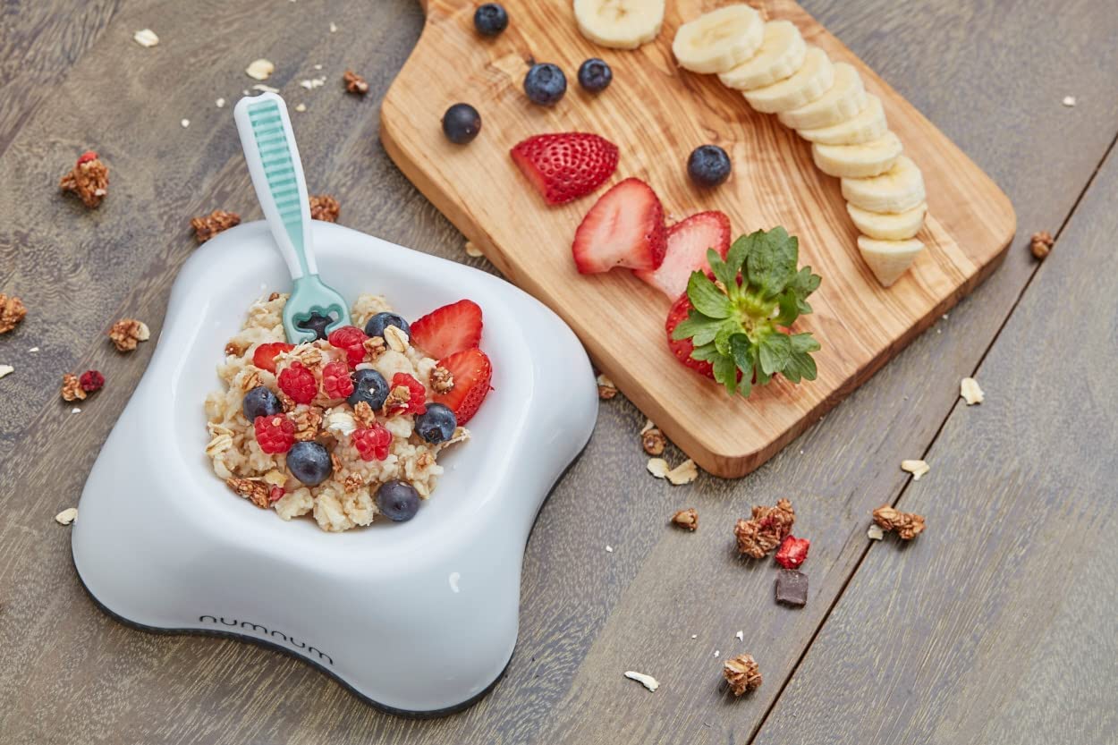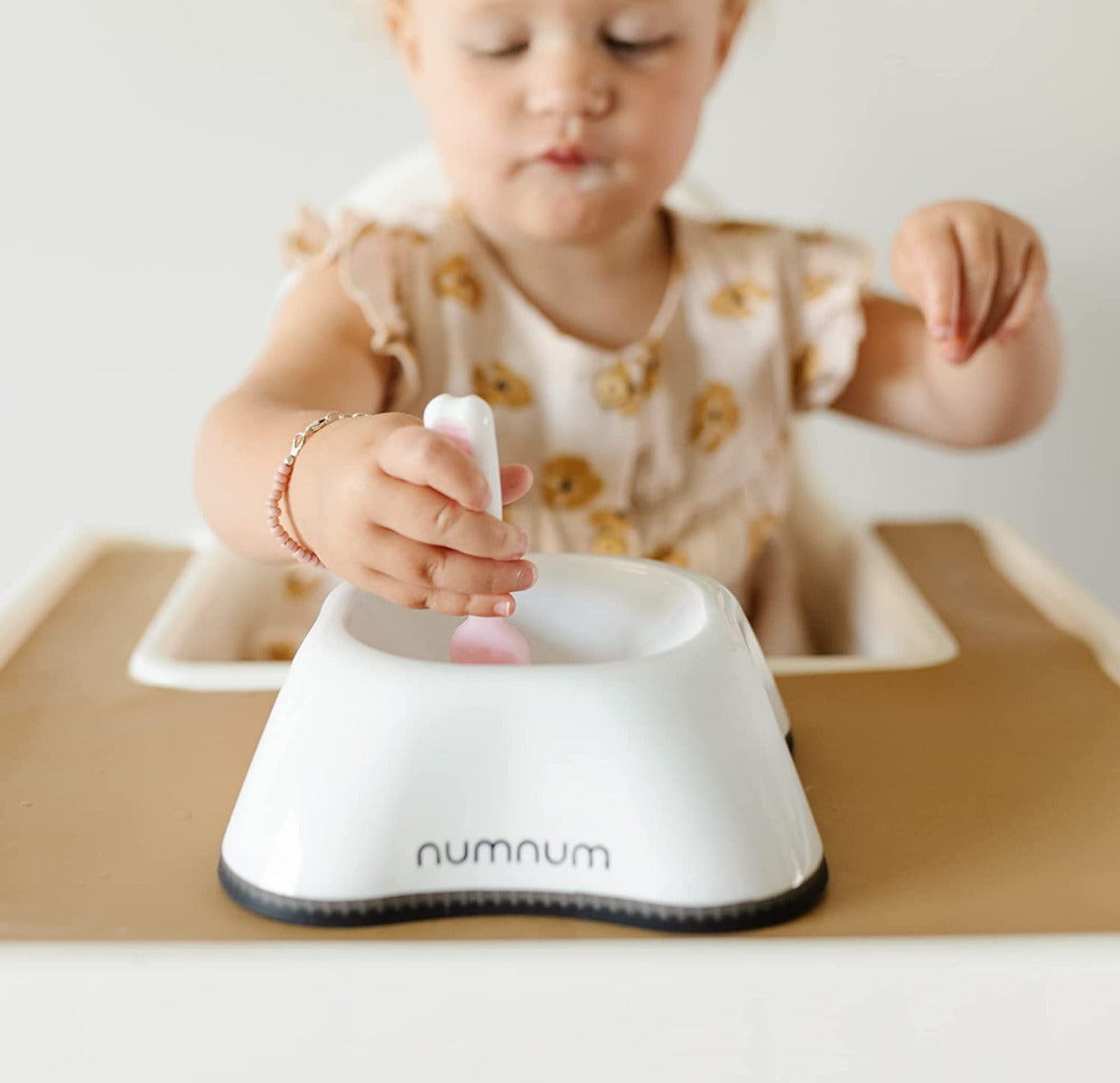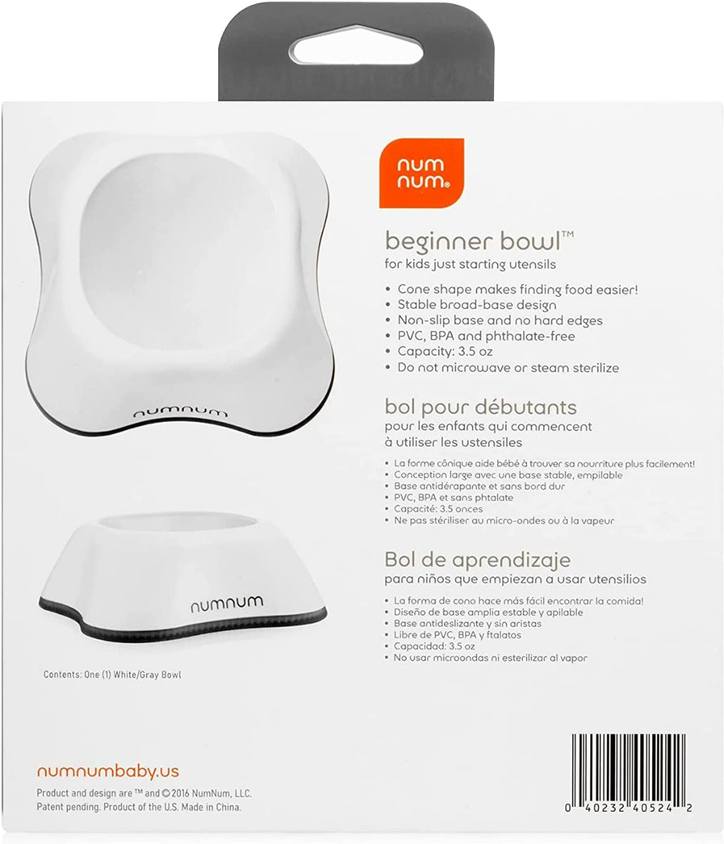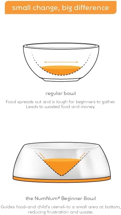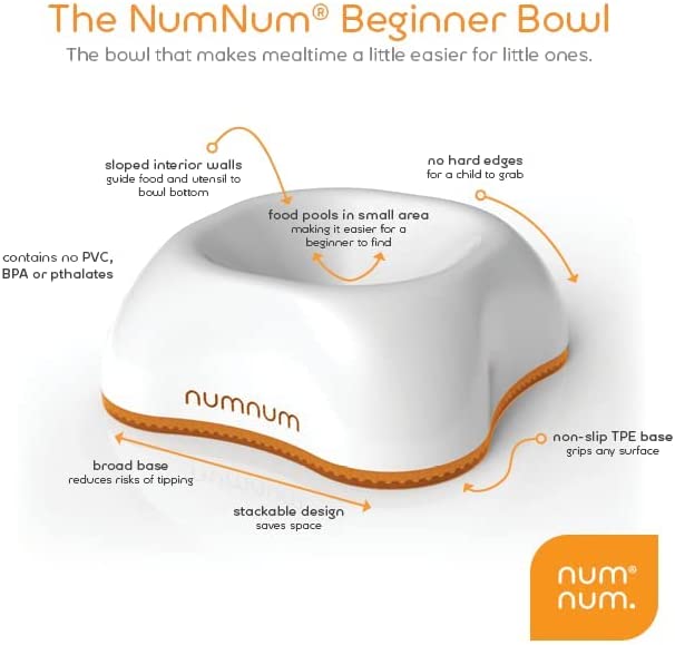 What baby bowl doesn’t tip or slip, has no hard edges for baby to grab & throw, and guides utensils to the food to grow confidence and facilitate learning? The new NumNum Beginner Bowl! The Cone-Shaped Interior makes it easier for little ones to find and enjoy every bite. Small pooling area that is easier for a beginner to find food, reducing frustration and waste. This bowl will stay put so your child can focus on learning to self-feed with a utensil!