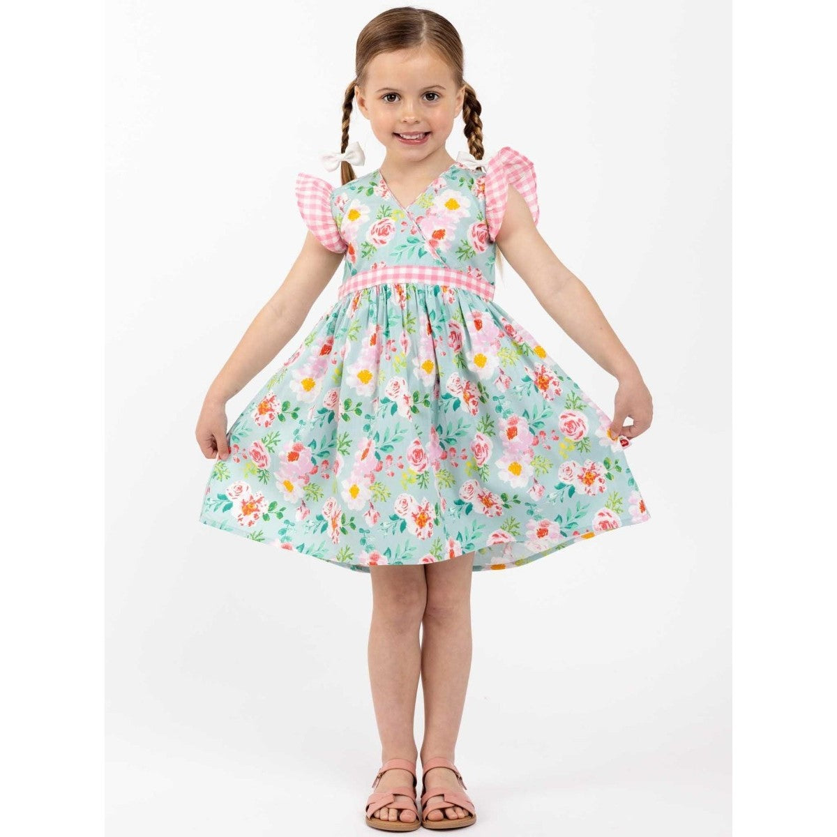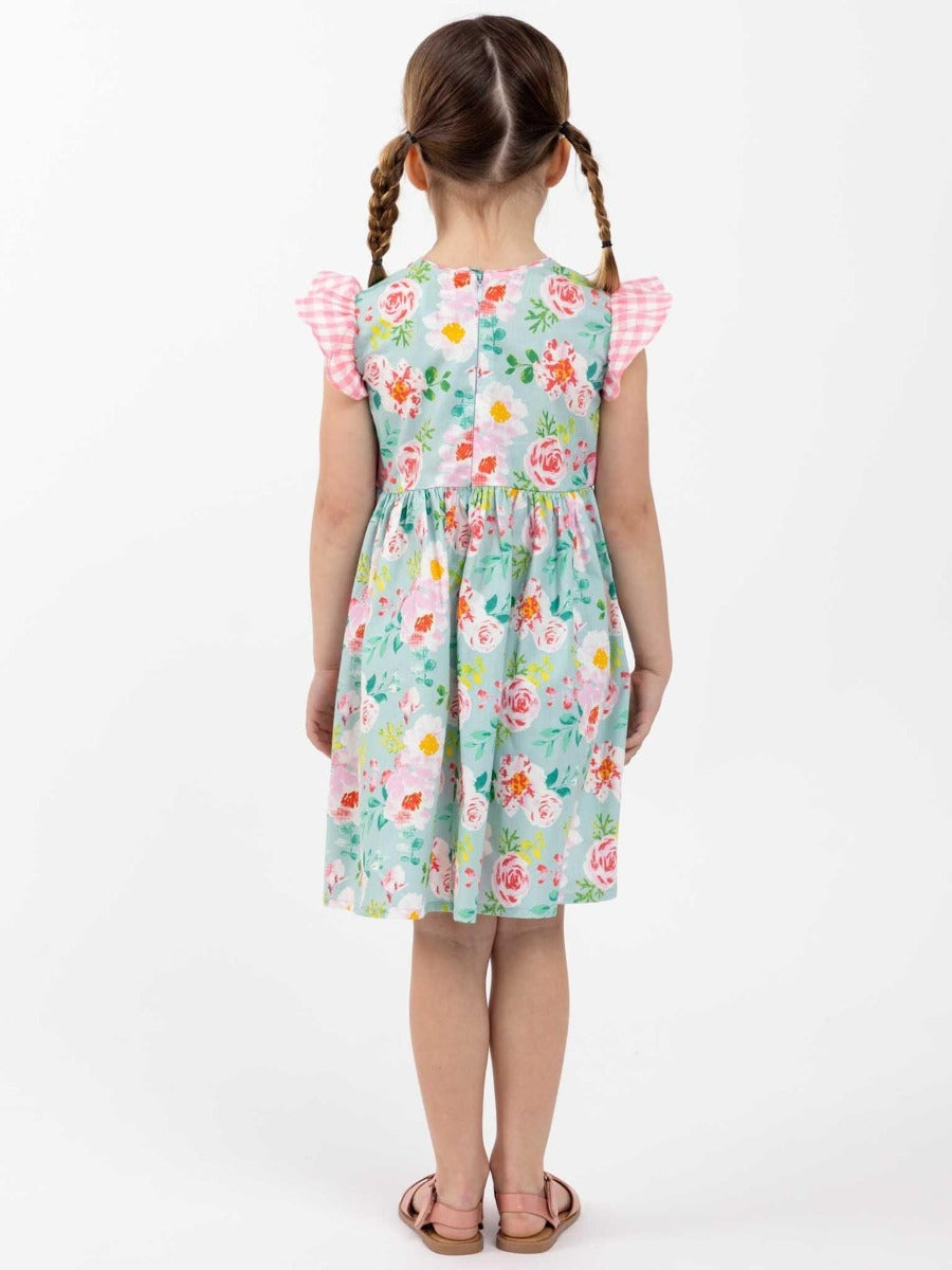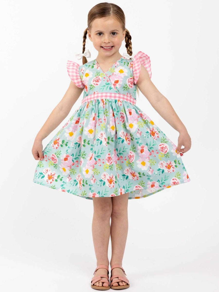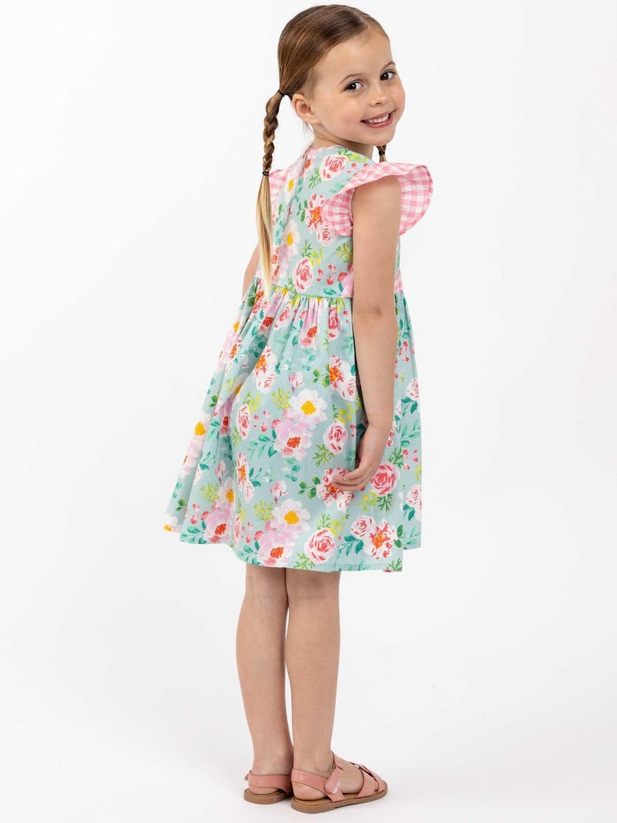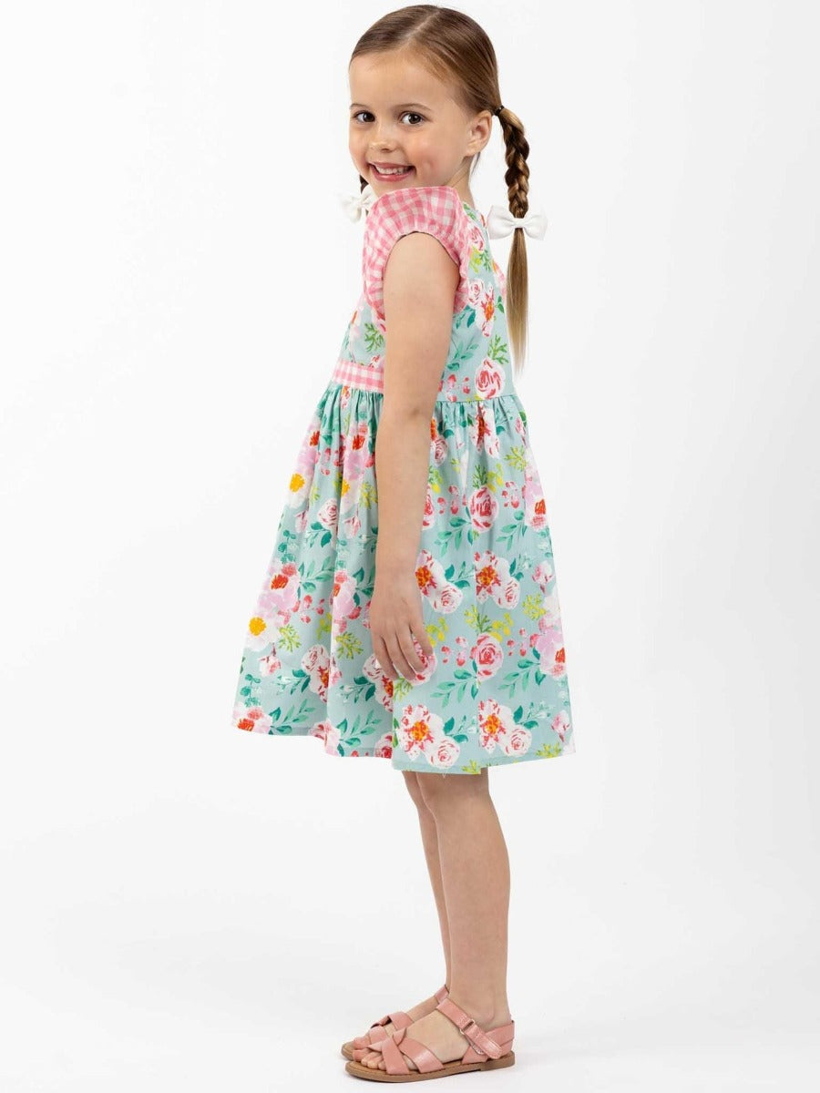 Oobi Adriana Blue Watercolor Dress is the sweetest little criss-cross front dress, Adriana has trims in our own in-house cotton, and Watercolour is hand printed on vintage screens. Old world, delicate floral, an easy-to-wear style, and the perfect summer or party dress for little girls.