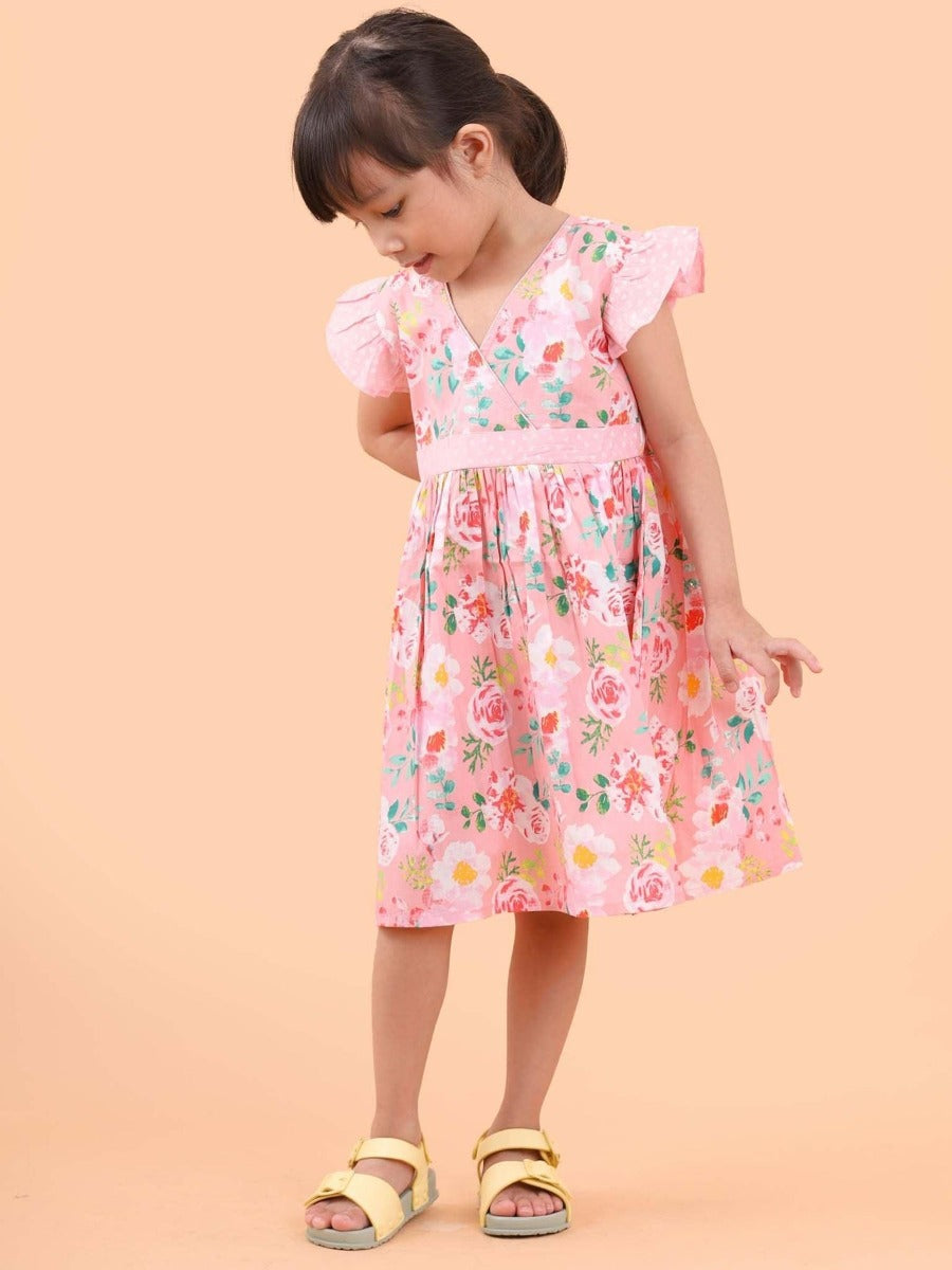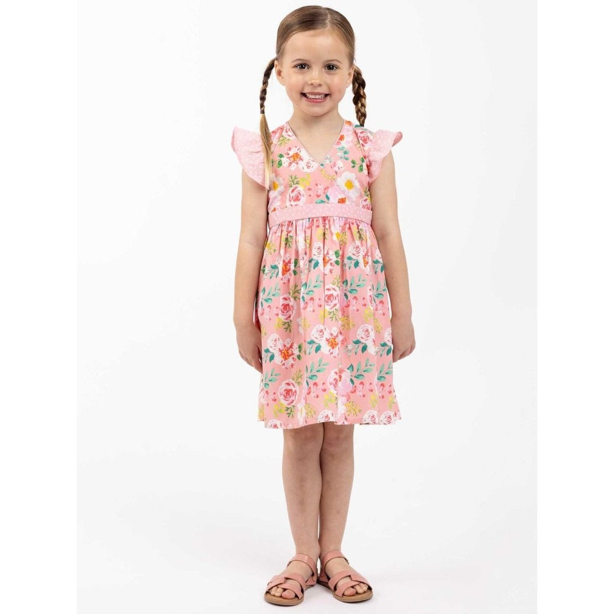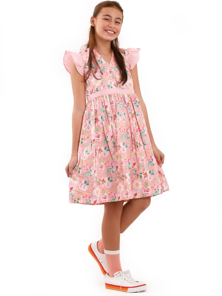 Oobi Adriana Pink Watercolor Dress is the sweetest little criss-cross front dress, Adriana has trims in our own in-house cotton, and Watercolour is hand printed on vintage screens. Old world, delicate floral, an easy-to-wear style, and the perfect summer or party dress for little girls.