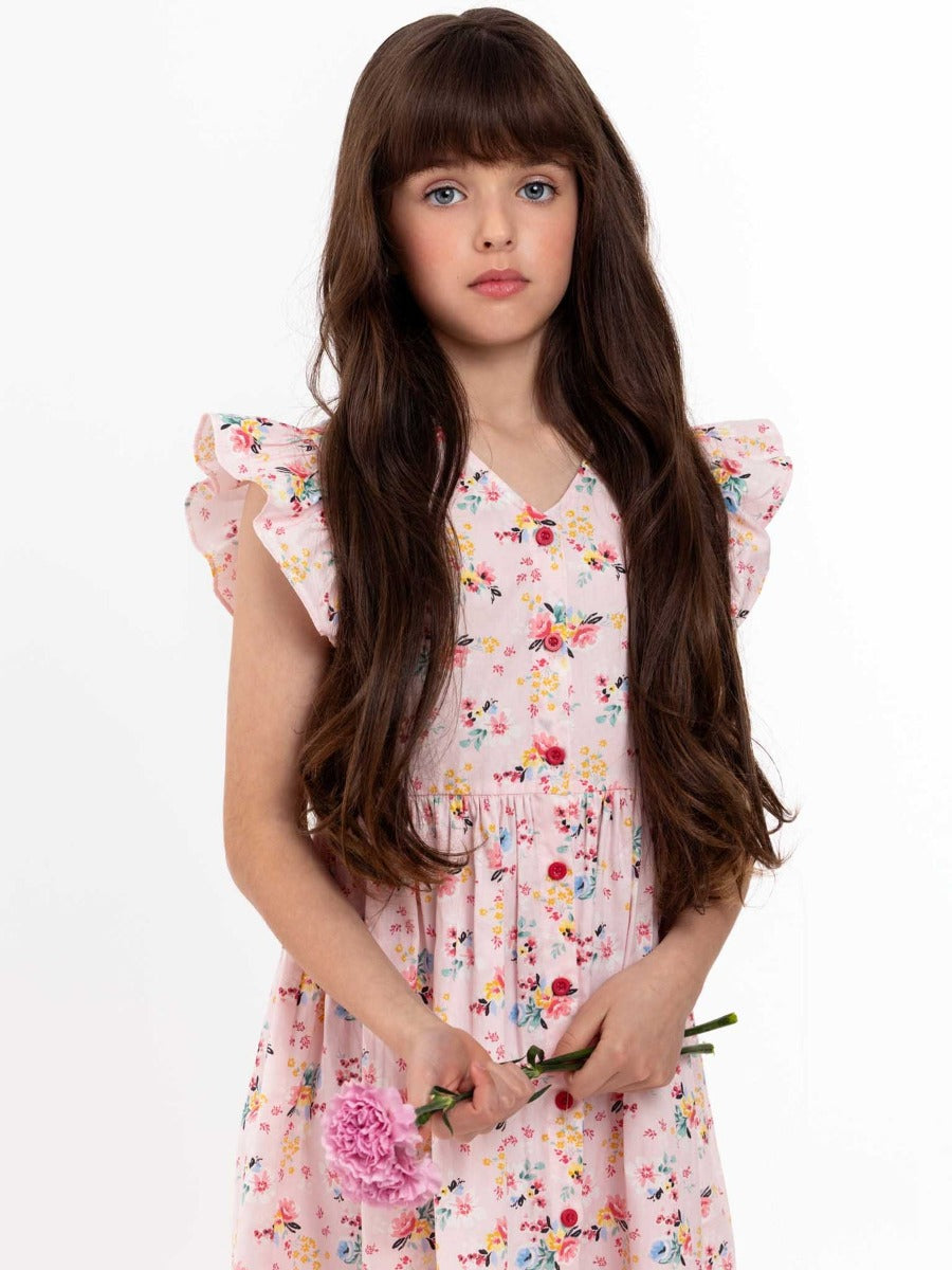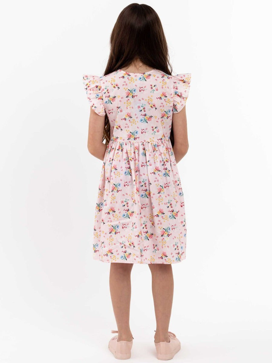 Oobi Vintage Pink Floral Madison Dress features buttons down the front, a swingy style, and generous flutter sleeves for protection from the Aussie sun. Decorative buttons don't need to be opened to wear, just pull on and pull off.