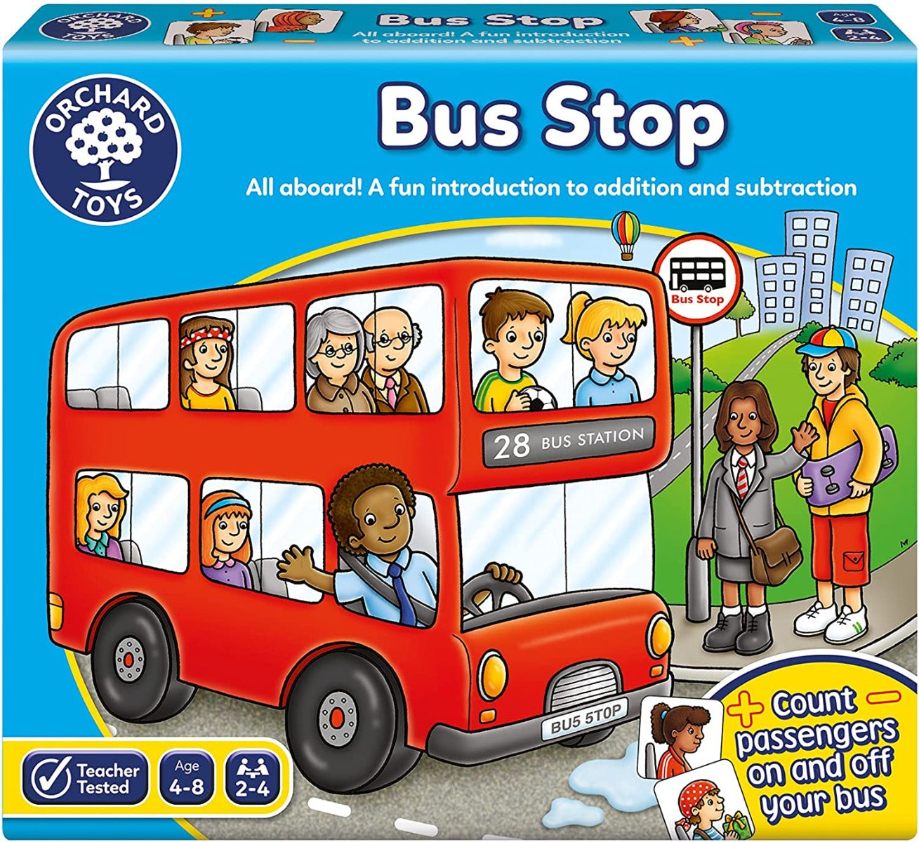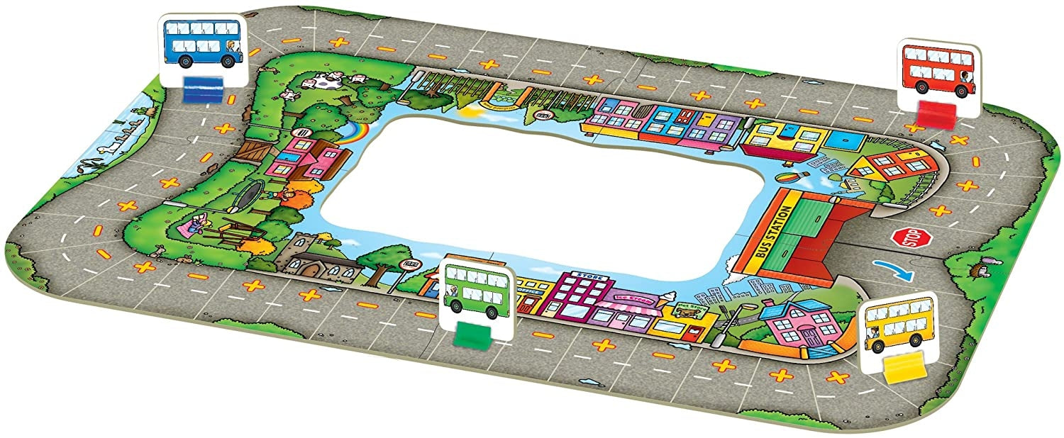 Orchard Toys Bus Stop Game is a fun addition and subtraction game. Race to the bus station, picking up and dropping off passengers as you go! Throw the dice to move your bus around the board, either landing on a plus or minus square. Players spin the spinner to determine the number of passengers to count on or off their bus. The winner is the player with the most passengers when their bus finally arrives at the bus station!