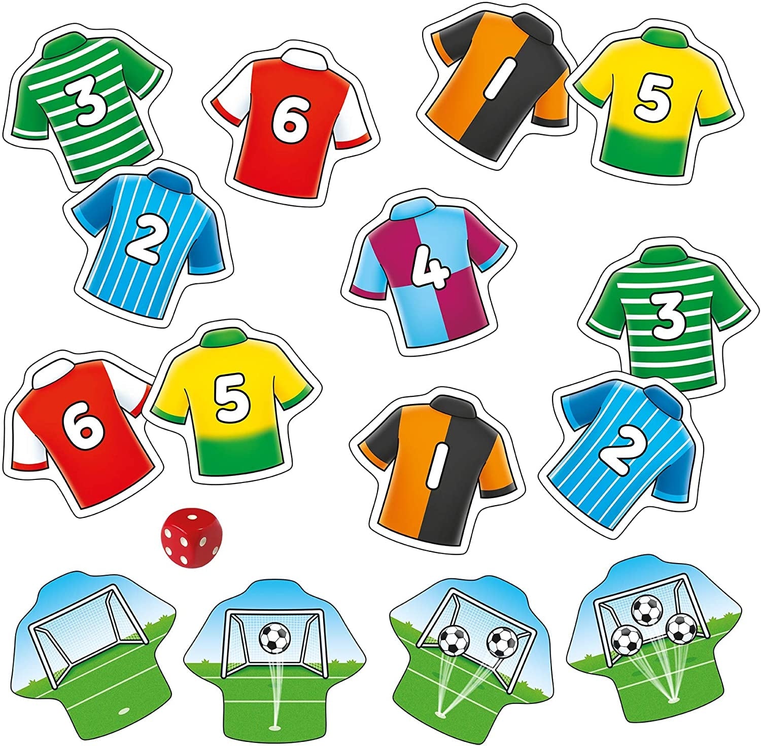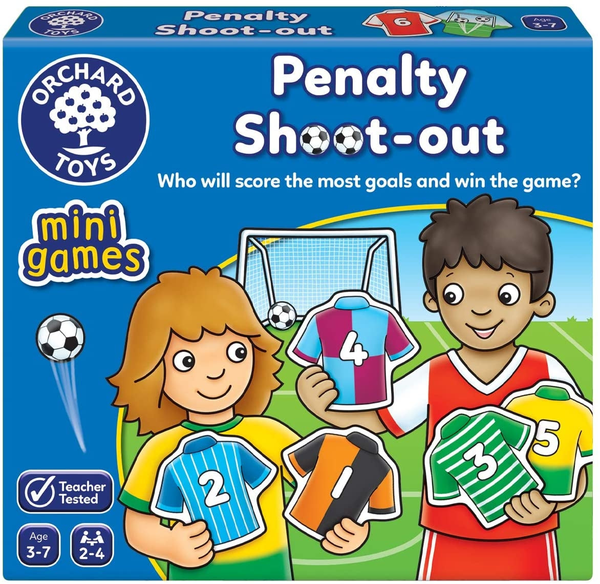 Orchard Toys Penalty Shoot Out Mini Game is a matching game that requires the players to roll the dice and match the spots to the number on the football shirts. The player then have to turn the card over and count the total number of footballs in the goal. At the end of the game, the player with the most number of footballs on the back of their card wins! Expect lots of fun with 24 football cards and 1 dice.