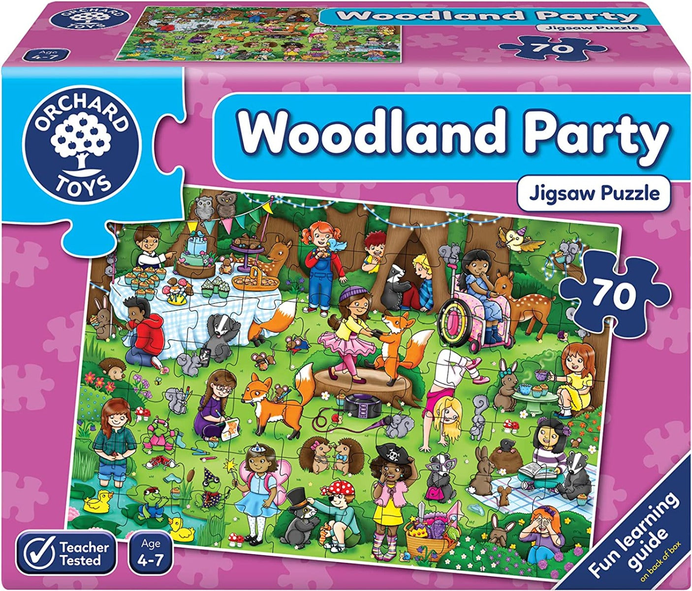 Orchard Toys Woodland Party Jigsaw Puzzle ia a colourful 70-piece jigsaw, depicting an enchanted woodland with lots of familiar characters and magical animal friends! Children will have fun piecing together this fairytale party and spotting all the different characters and animals.