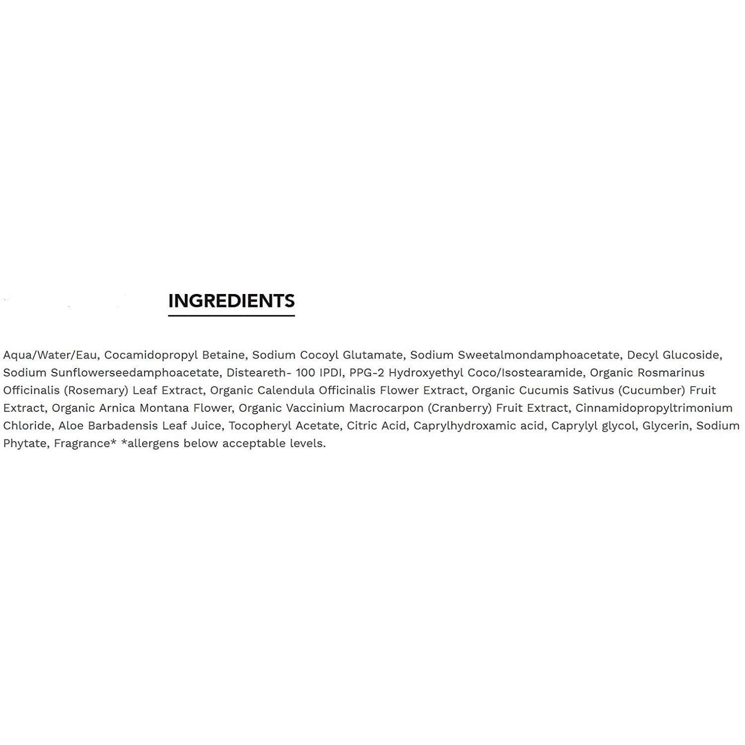 Aqua/Water/Eau, Cocamidopropyl Betaine, Sodium Cocoyl Glutamate, Sodium Sweetalmondamphoacetate, Decyl Glucoside, Sodium Sunflowerseedamphoacetate, Disteareth- 100 IPDI, PPG-2 Hydroxyethyl Coco/Isostearamide, Organic Rosmarinus Officinalis (Rosemary) Leaf Extract, Organic Calendula Officinalis Flower Extract, Organic Cucumis Sativus (Cucumber) Fruit Extract, Organic Arnica Montana Flower, Organic Vaccinium Macrocarpon (Cranberry) Fruit Extract, Cinnamidopropyltrimonium Chloride, Aloe Barbadensis Leaf Juice, Tocopheryl Acetate, Citric Acid, Caprylhydroxamic acid, Caprylyl glycol, Glycerin, Sodium Phytate, Fragrance* *allergens below acceptable levels.