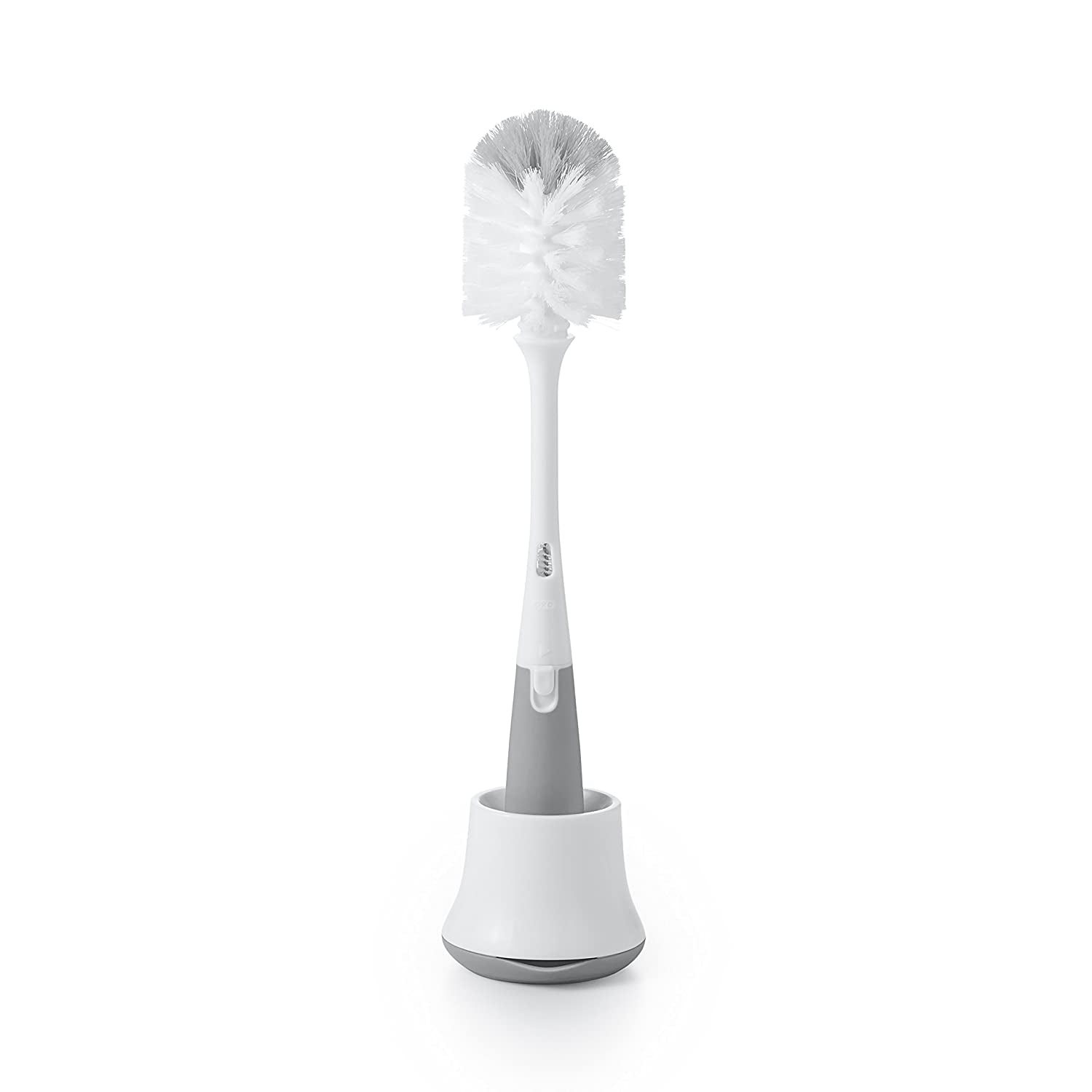 OXO Tot Bottle Brush with Nipple Cleaner and Stand is a 2 in 1 brush - the large bottle brush at one end and the tinier nipple brush concealed in the other end. This handy multi-tool can be used to clean a variety of baby feeding equipment: bottles, nipples, and breast pump parts. The soft and firm bristles allow for gentle cleaning or serious scrubbing. The Detail Cleaner and grant access to tight spots. Ventilation holes and stand keep the brush dry.