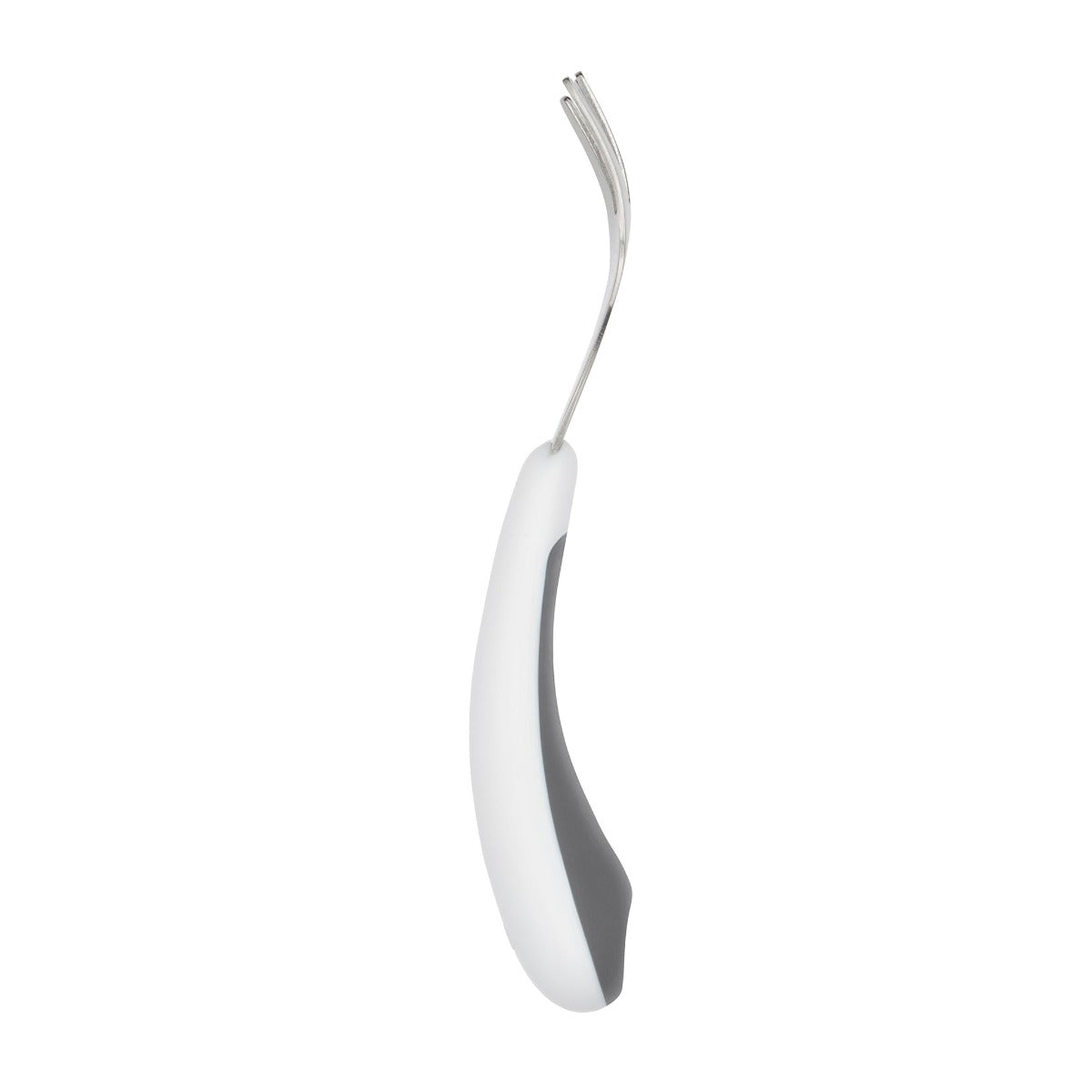 Fork prongs feature a patent-pending design where inner prongs are deeper than outer prongs to create a slight U-shape for easy scooping and ergonomic reasons.