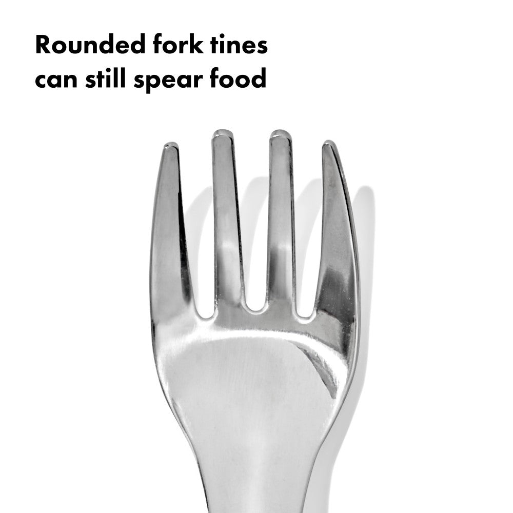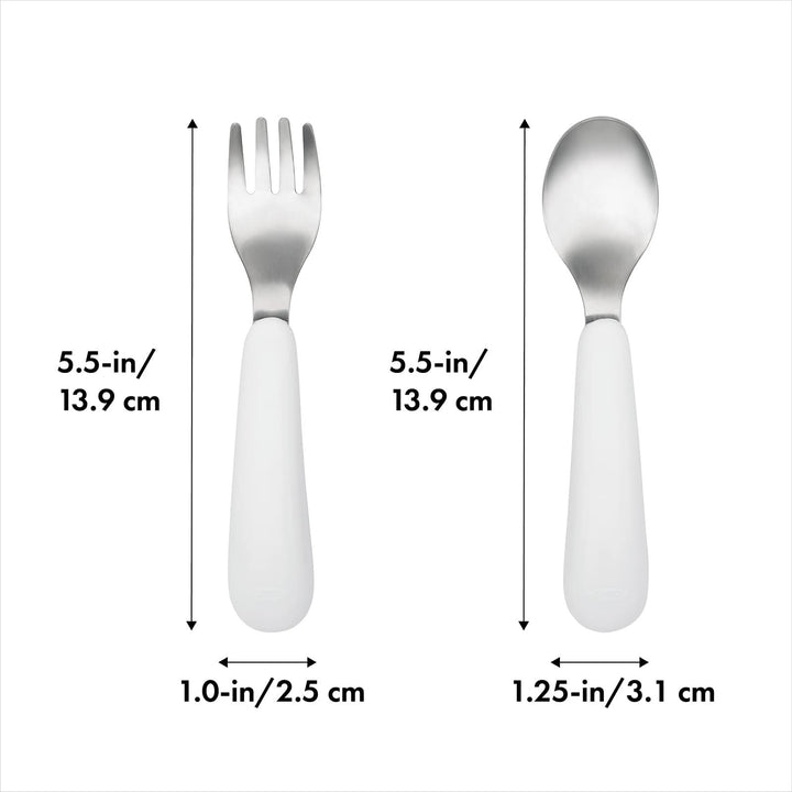 OXO Tot Fork & Spoon Set are a set of easy-grip utensils (fork & spoon) that helps tots learn to feed themselves. Both Fork and Spoon make it easy for young eaters to get their food from dish to mouth. A flat spot on the handles prevents the fork and spoon from rolling off the table or high chair tray, and the soft grips are shaped to keep them from sliding into bowls or plates. Made of durable stainless steel.