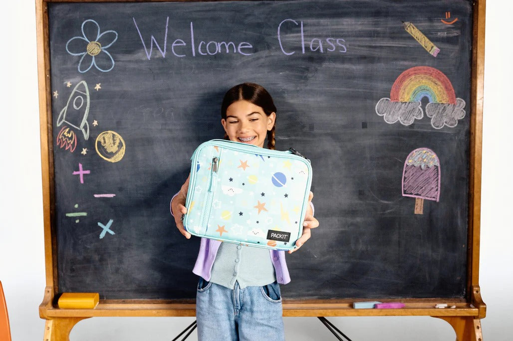 PackIt Freezable Classic Lunch Box is the only horizontal lunch box that chills healthy food for hours. Freezable gel is built into the lunch box so you'll never waste money on ice packs again. The lunch box's top-load design makes it easy to pack flat containers like bento boxes. A buckle handle clips onto totes, backpacks or sports bags for convenient travel to and from school, daycare and sports activities. There's also a mesh pocket fits a small water bottle and a slim zip pocket. The old-school lunch box is getting PackIt’s cool tech twist!