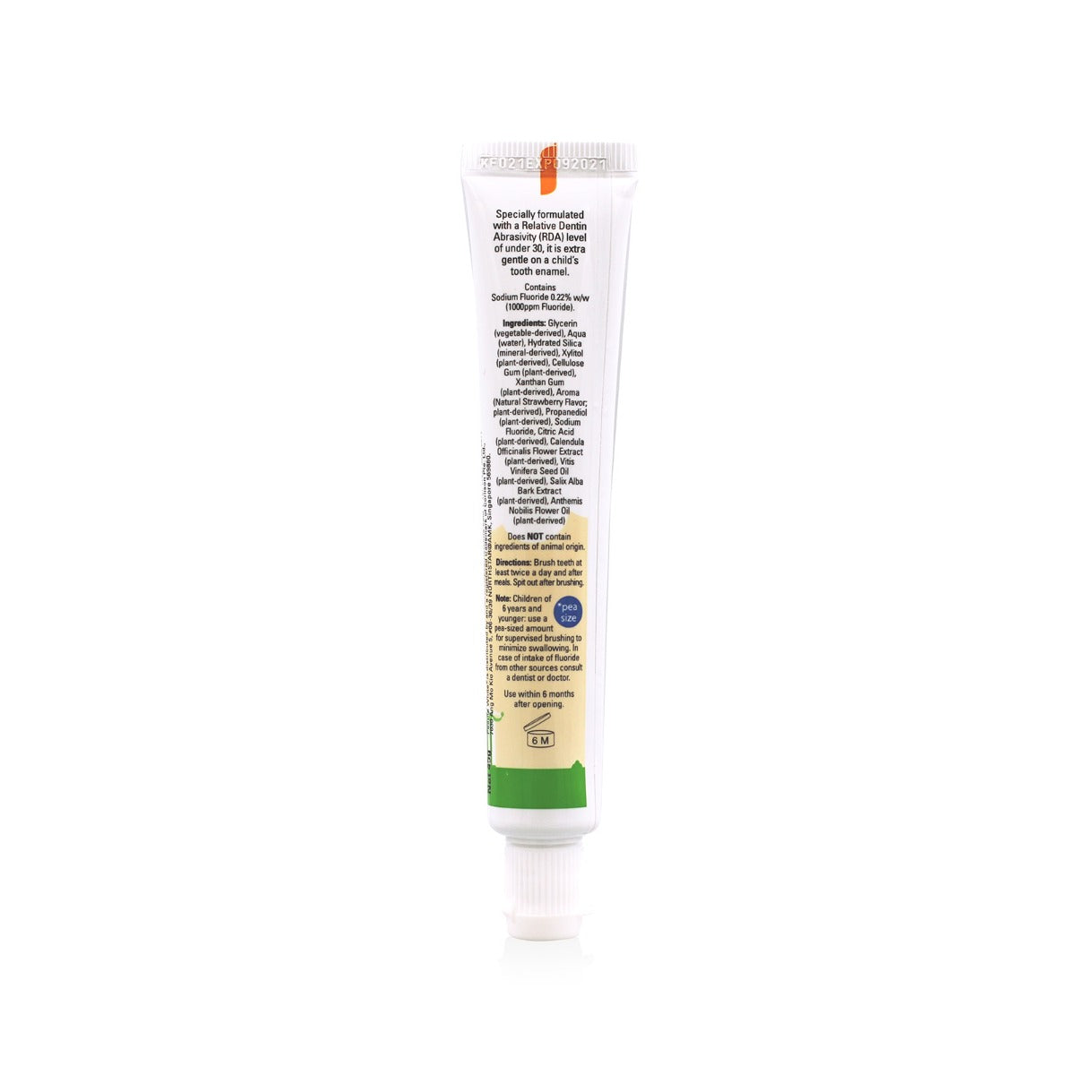 Full ingredient listing: Glycerin (vegetable-derived), Aqua (water), Hydrated Silica (mineral-derived), Xylitol (plant-derived), Celullose Gum (plant-derived), Aroma (Natural Strawberry Flavour; plant-derived), Propanediol (plant-derived), Sodium Fluoride, Citric Acid (plant-derived), Calendula Officinalis Flower Extract (plant-derived), Vitis Venifera Seed Oil (plant-derived), Willow Alba Bark Extract (plant-derived), Anthemis Nobilis Flower Oil (plant-derived)