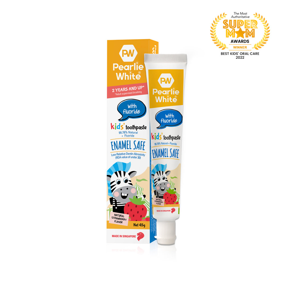 Pearlie White Enamel Safe Kids’ Fluoride Toothpaste (Strawberry) 45g is an all natural ingredients toothpaste that contains dentist-recommended dosage of fluoride. This toothpaste is 99.78% natural and the remaining 0.22% in the form of sodium fluoride delivers 1000ppm of fluoride. Our Enamel Safe Kids’ Toothpaste will do the job of cleaning your kids teeth and it will do the job extra gently as it has an extremely low relative dentin abrasivity (RDA) value of under 30, preventing paste from harming your child’s enamel and gums as they brush. Most adult toothpaste variants have an RDA value of 100 and above.