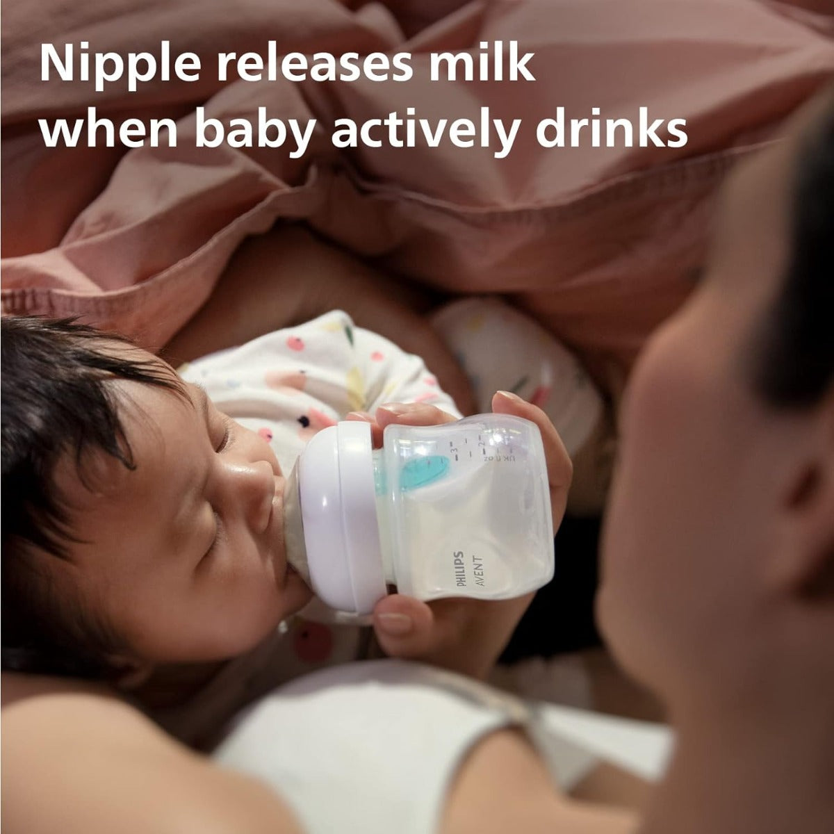 Philips Avent Natural Response Airfree Baby Gift SetΒ is a set that includes 2x 4 oz/125 ml Baby Bottles, 2x 9 oz/260 ml Baby Bottle, 1 x bottle brush, 1 x ultra soft soother (0β6 m) and 2x Airfree Vent. These bottles are equipped with Natural Response Nipples and Airfree Vent. The Natural Response Nipple releases milk only when the baby actively drinks. Babies can drink, swallow and breathe using their natural rhythm, like on the breast. Making it easy to combine breast and bottle feeding. The Airfree vent prevents air from getting into your little one's tummy whilst feeding upright. 125ml bottles comes with Flow 2 teats, 260ml bottles comes with Flow 3 teats.
