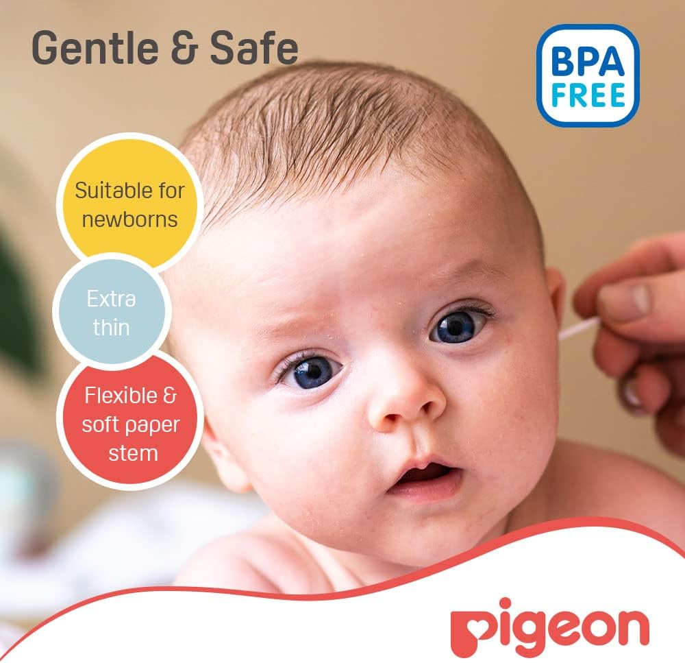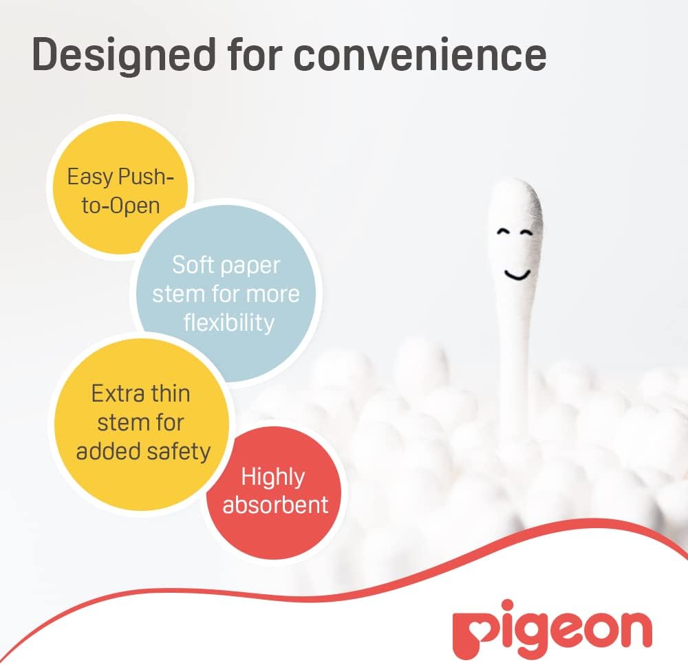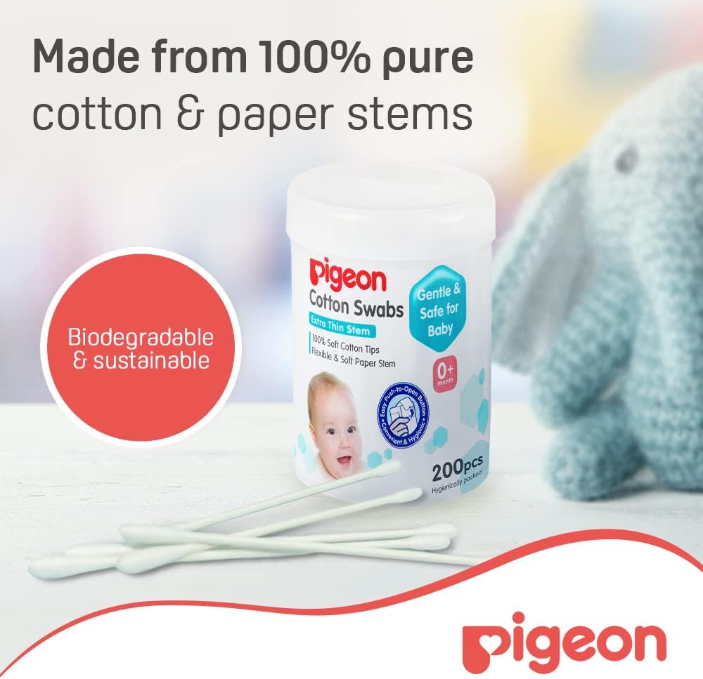 Pigeon Baby Cotton Swabs (200pc) - Extra Thin is designed for the delicate care of newborns, making it easy to clean small areas like the ears, nose, and belly button. Featuring an extra-thin stem for enhanced flexibility and softness, these swabs are made from high-quality 100% pure cotton to ensure safety and hygiene. The pliable, soft paper stems provide added safety for babies while being environmentally friendly with their biodegradable design. Conveniently stored in a hinged plastic case, these swabs are easy to retrieve and keep organized, offering the perfect blend of functionality and care for your little one.