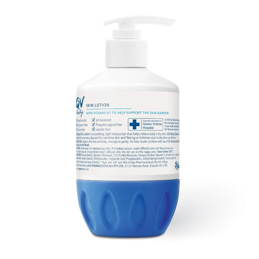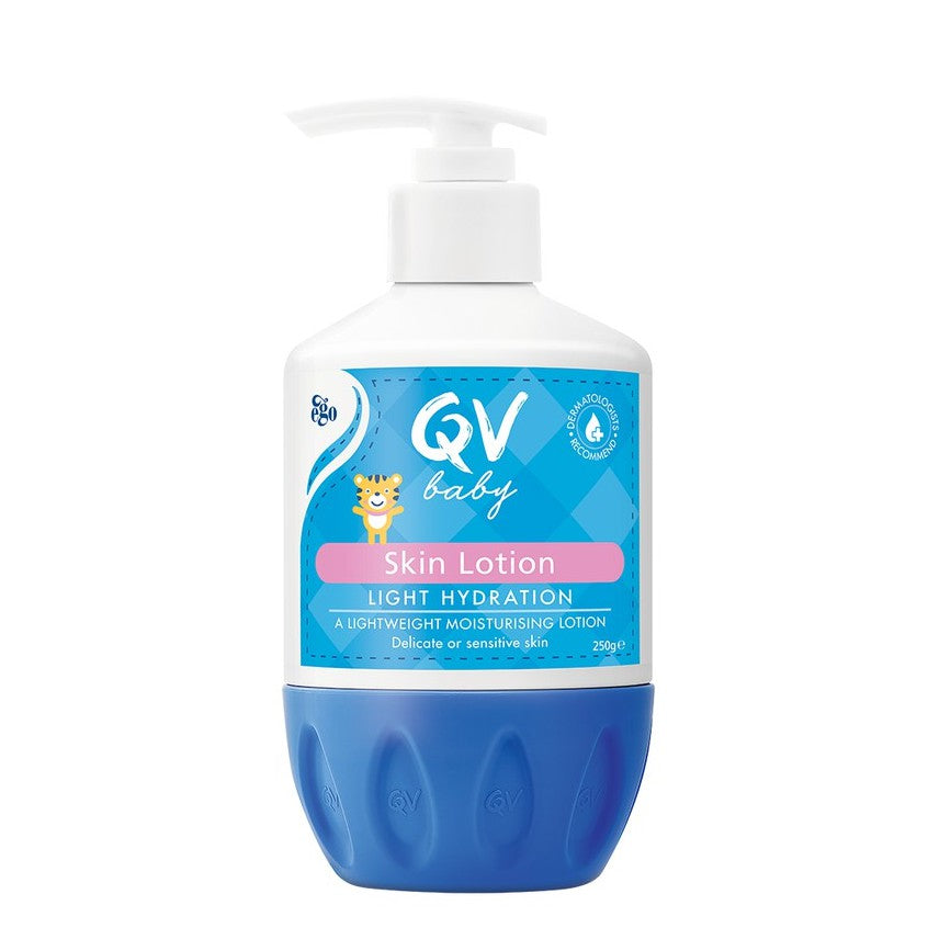 QV Baby Skin Lotion is a lightweight moisturising lotion, designed to help soothe and relieve dry skin. This fragrance-free formulation is fast-absorbing and is designed for baby’s dry, delicate or sensitive skin.