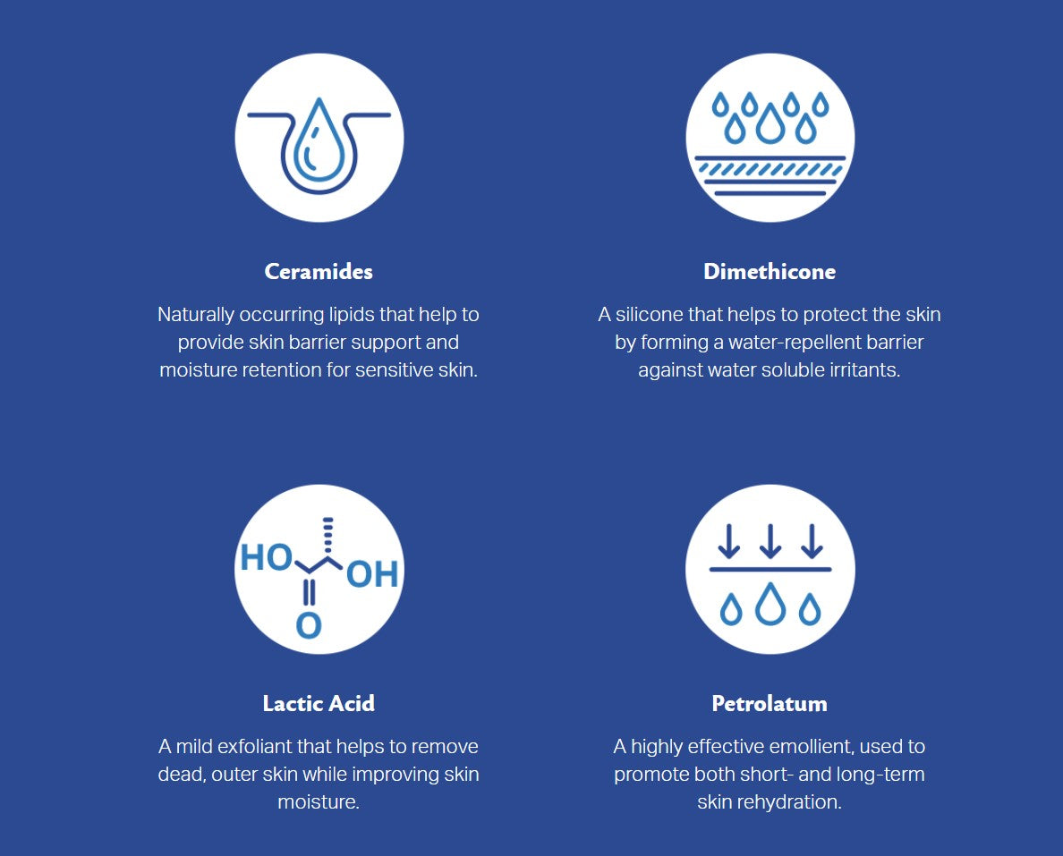 Aqua (Water), Petrolatum, Sodium Lauroyl Sarcosinate, Glycerin, Niacinamide, Lauryl Betaine, Lactic Acid, Sodium Cocoyl Isethionate, Sodium PCA, Xanthan Gum, 1,2-Hexanediol, Caprylyl Glycol, Sodium Polyacrylate, Ceramide NP, Cholesterol, Carthamus Tinctorius (Safflower) Seed Oil, Ceramide EOP.