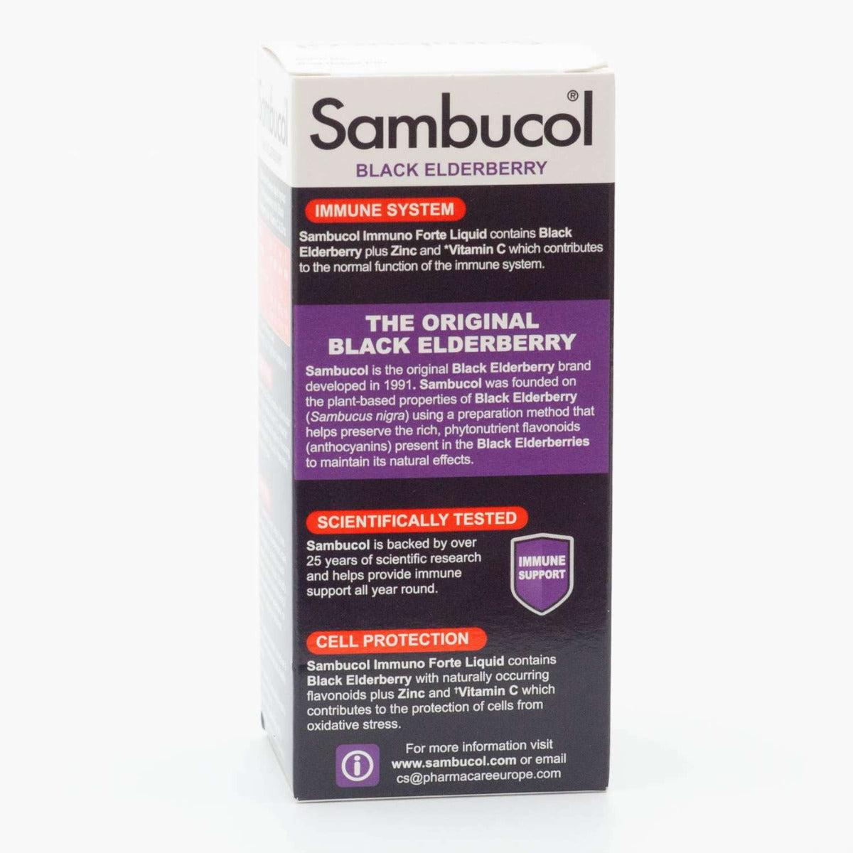 Sambucol Immuno Forte Liquid is a food supplement packed with black elderberries. Black elderberries contain naturally occurring flavonoids and have twice the natural antioxidant capacity of blueberries and more than 50% the overall antioxidant capability of cranberries. Sambucol Immuno Forte also contains Vitamin C and Zinc, which are well known for their ability to support the immune system. Antioxidants strengthen the immune system by helping neutralise the harmful effect of free radicals.