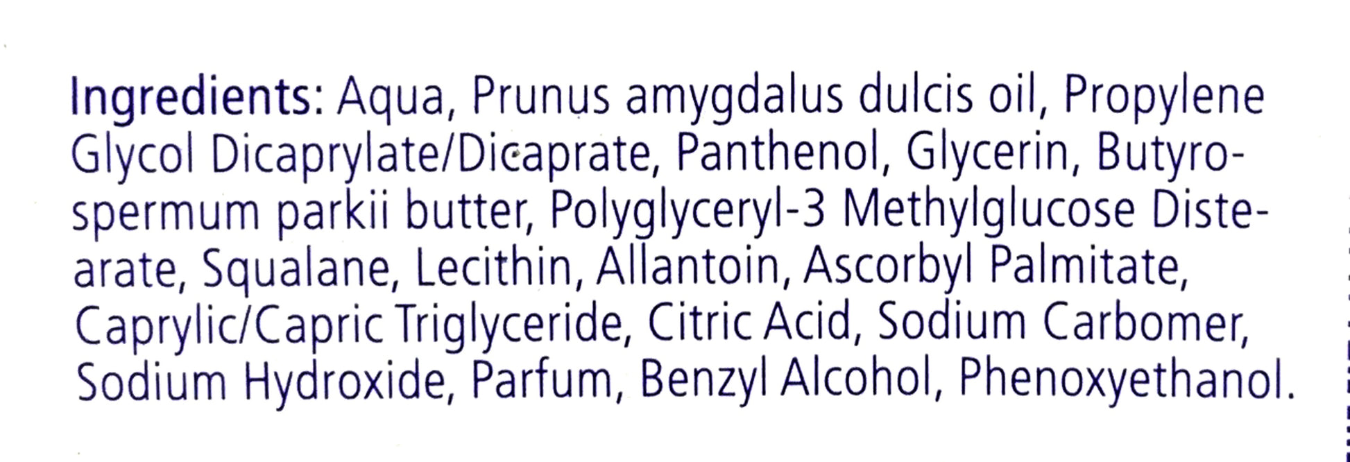 Aqua, Prunus amygdalus dulcis oil, Propylene Glycol Dicaprylate/Dicaprate, Panthenol, Glycerin, Butyrospermum parkii butter, Polyglyceryl-3 Methylglucose Distearate, Squalane, Lecithin, Allantoin, Ascorbyl Palmitate, Caprylic/Capric Triglyceride, Citric Acid, Sodium Carbomer, Sodium Hydroxide, Parfum, Benzyl Alcohol, Phenoxyethanol