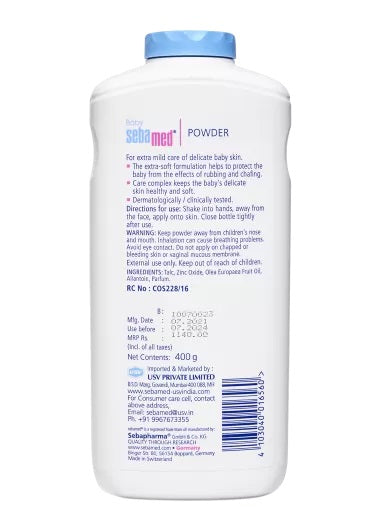 Sebamed Baby Powder is a micronized form of TiO2 that reduces the effect of rubbing & chafing. Absorbs extra moisture from baby's skin to help skin feel comfortable. Extra soft formula with Allentown helps in protecting the baby's delicate skin against irritation. Olive Oil present in Sebamed Baby Powder soothes and protects baby's skin from dryness.