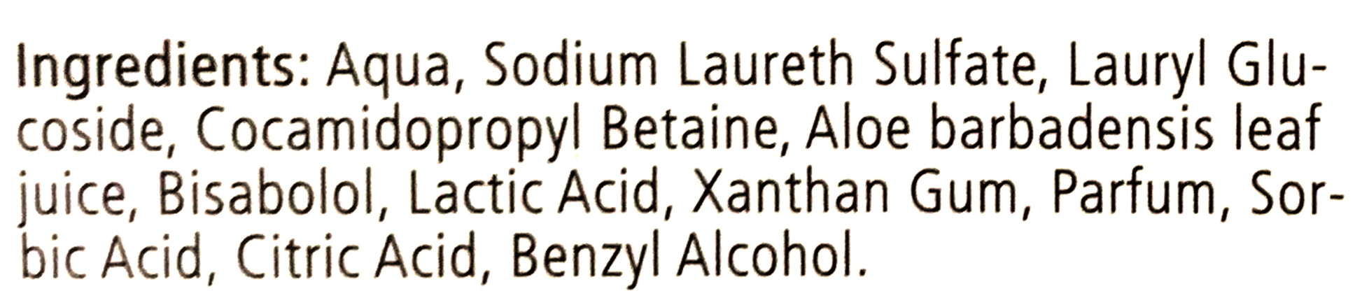 Aqua, Sodium Laureth Sulfate, Lauryl Glucoside, Cocamidopropyl Betaine, Aloe barbadensis leaf juice, Bisabolol, Lactic Acid, Xanthan Gum, Parfum, Sorbic Acid, Citric Acid, Benzyl Alcohol.