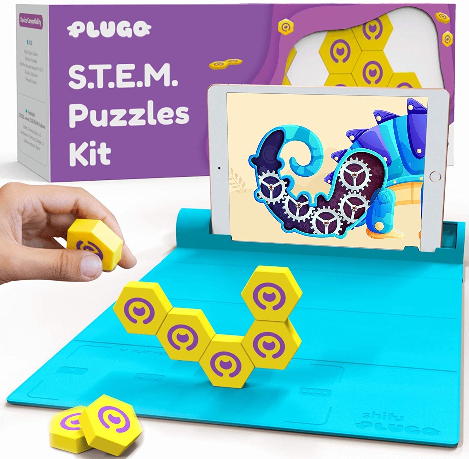 - IN THE BOX - The kit contains a Letters Trunk and 48 letter tiles. It comes with the Plugo gamepad, a foldable mat with embedded magnets to hold the Plugo kit on one side, and your device goes in the slot on the other side.