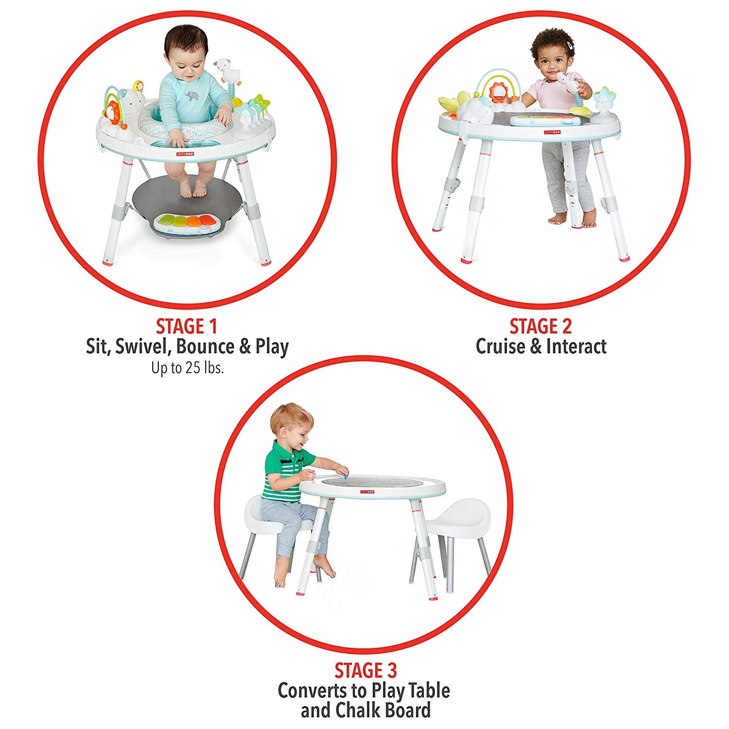 - 3 stages of use: Sit, swivel, bounce & play; Cruise & interact; Play table
