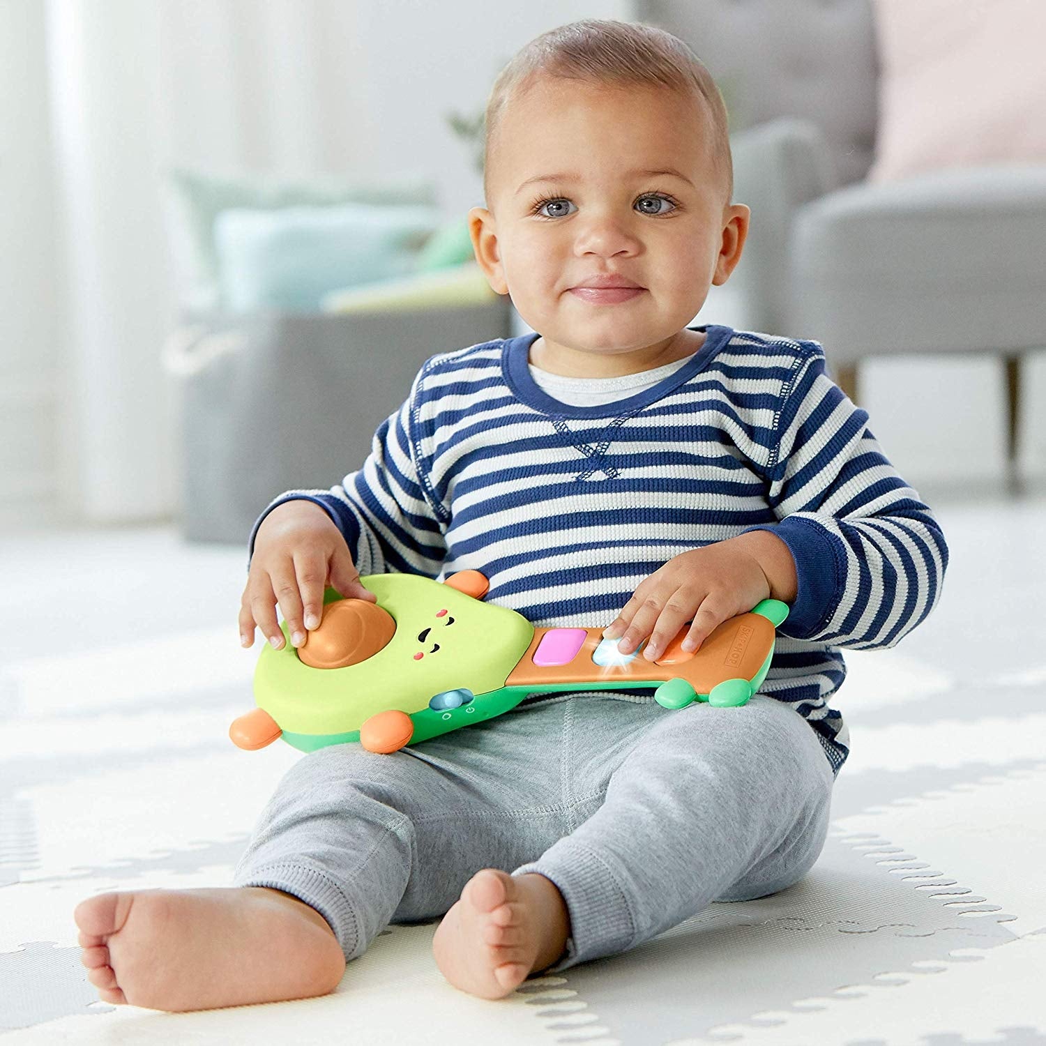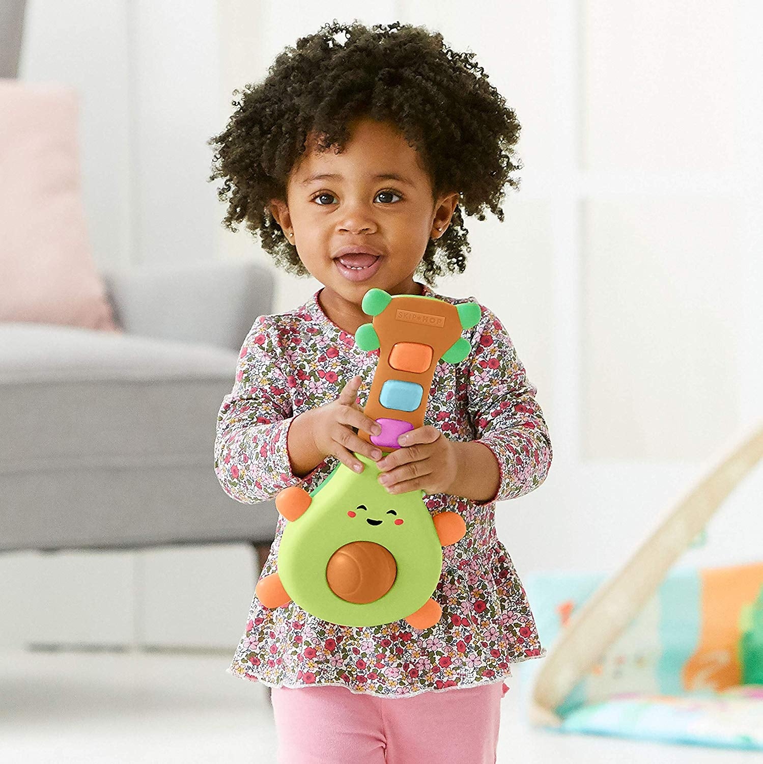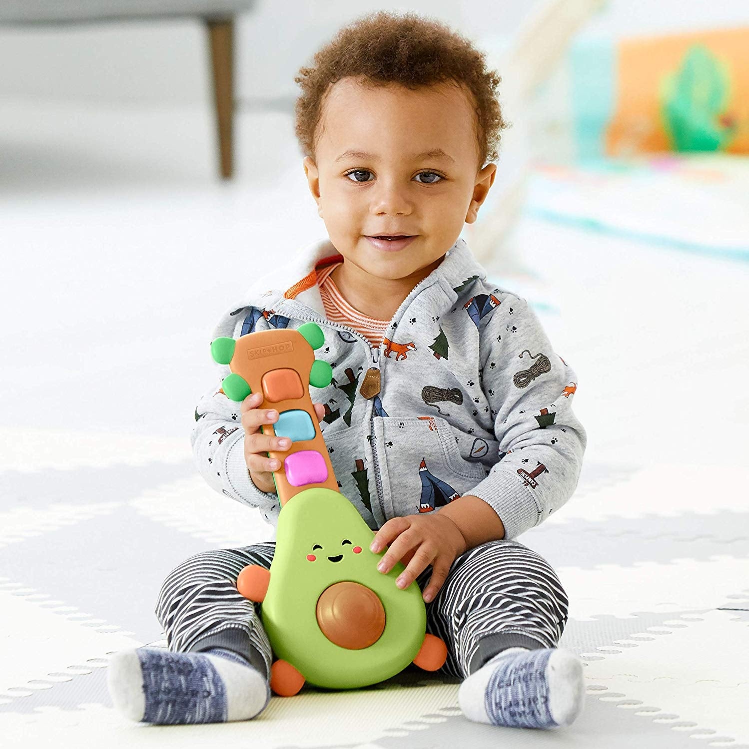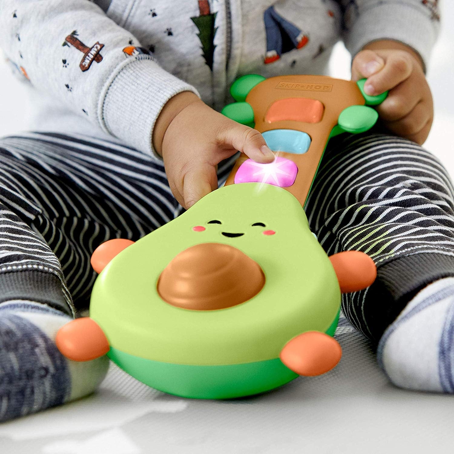 Skip Hop Farmstand Rock-A-Mole Guitar is a electronic toy avocado guitar. It lights up and plays music when you press the buttons.Β A little bit country and totally guac & roll! This adorable avocado guitar inspires mini musicians with strumming riffs, fun tunes and more! Easy for little hands to holdβjust spin the avocadoβs βpitβ or press the light-up buttons and guac out!