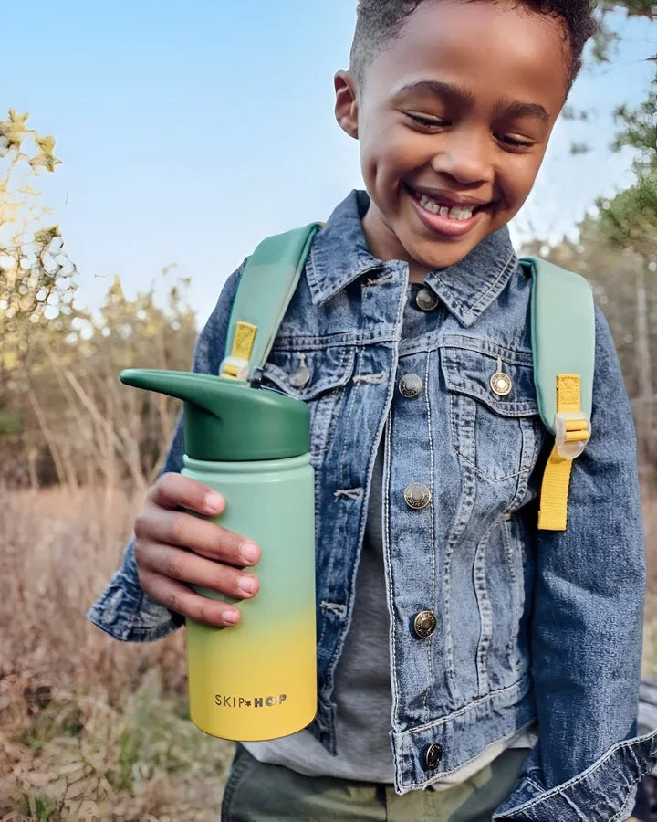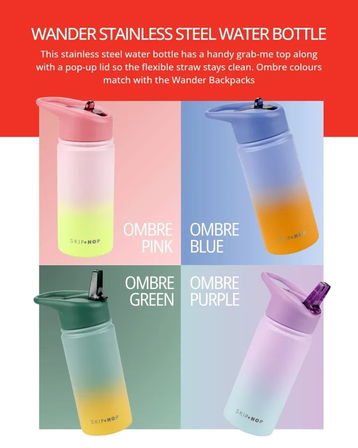 Skip Hop Wander Stainless Steel Water Bottle c omes with a a flip-up straw and a cool canteen vibe, our stainless steel straw bottle for kids helps keep liquids cold for up to 12 hours. Featuring eye-catching ombrΓ© color effects and a streamlined shape, itβs a must-have for sipping on the go.