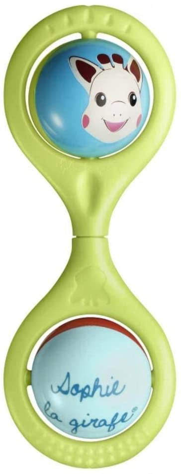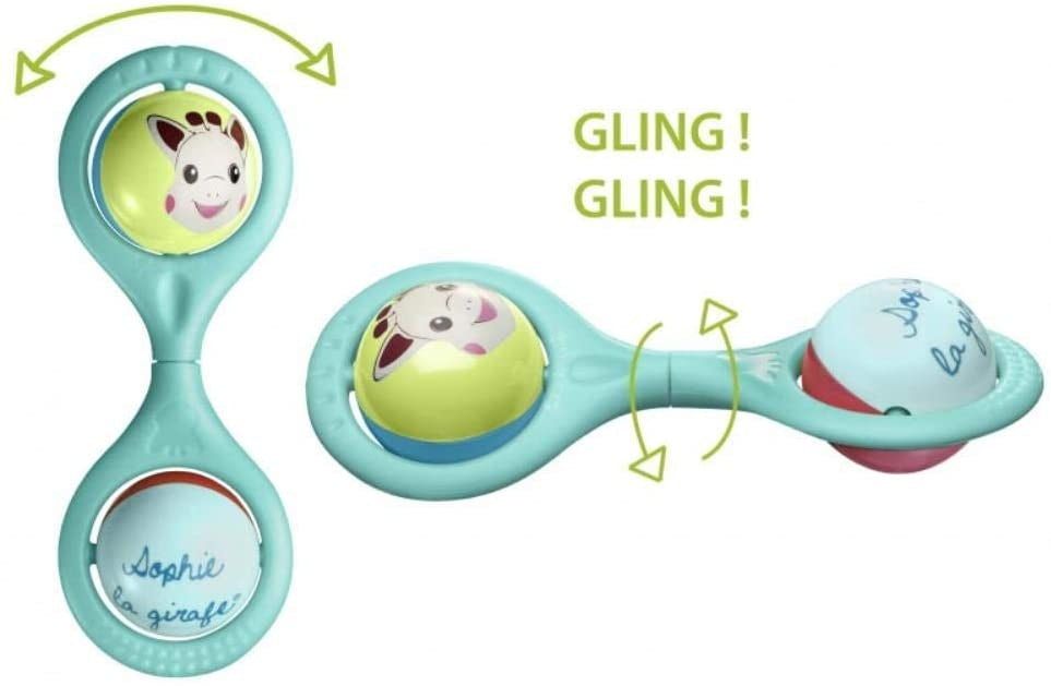 Sophie the Giraffe Twist Rattle is a twisty rattle with 2 spinning balls at each end. It makes a light jingling sound when baby shakes it.