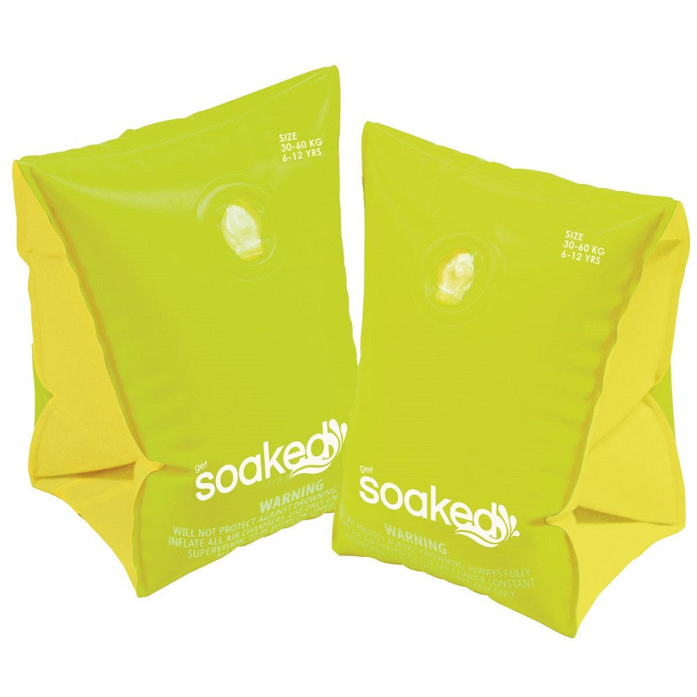 Splash About Get Soaked Kids Armbands is a pair of swimming arm floats that are easy to put on even when inflated, they are a distinctive yellow colour that is easily spotted in the water. Made from strong PVC these armbands are designed to help children increase their water confidence.