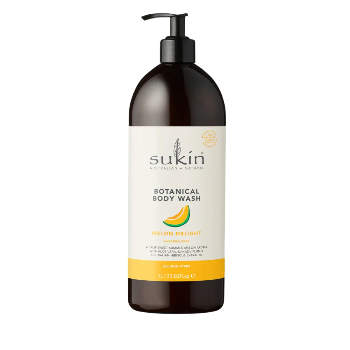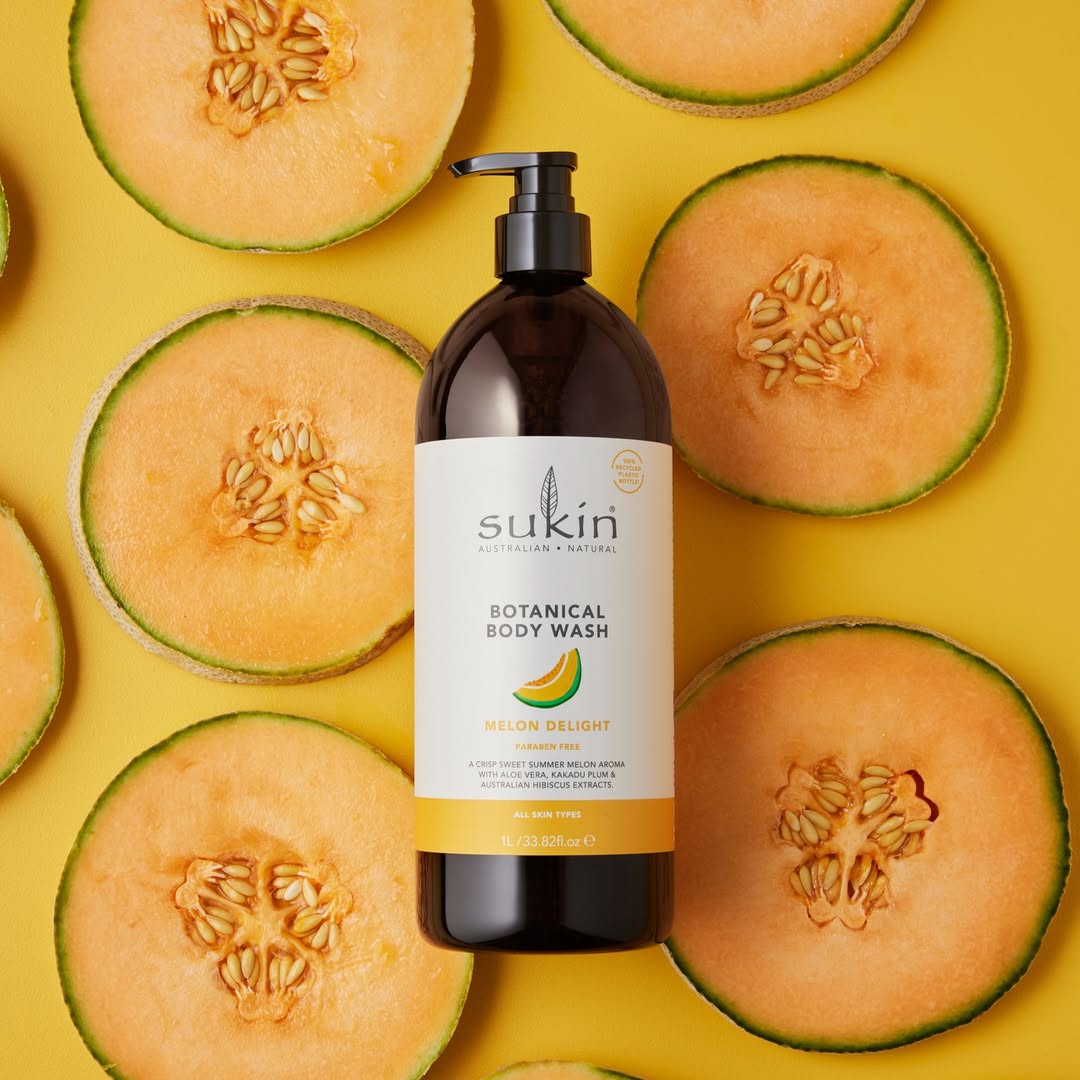 Sukin Botanical Body Wash delights the senses with its crisp sweet melon scent with hints of rosewood, musk and cedar while leaving skin feeling clean and nourished. Zesty Lemon and Ripe Cantaloupe Melon envelop you to electrify and enliven the senses whilst you wash. A sweet, decadent and ready to party experience. Formulated with Kakadu Plum and Australian Hibiscus Extracts to hydrate the skin, while calming Aloe Vera leaves skin feeling soothed.