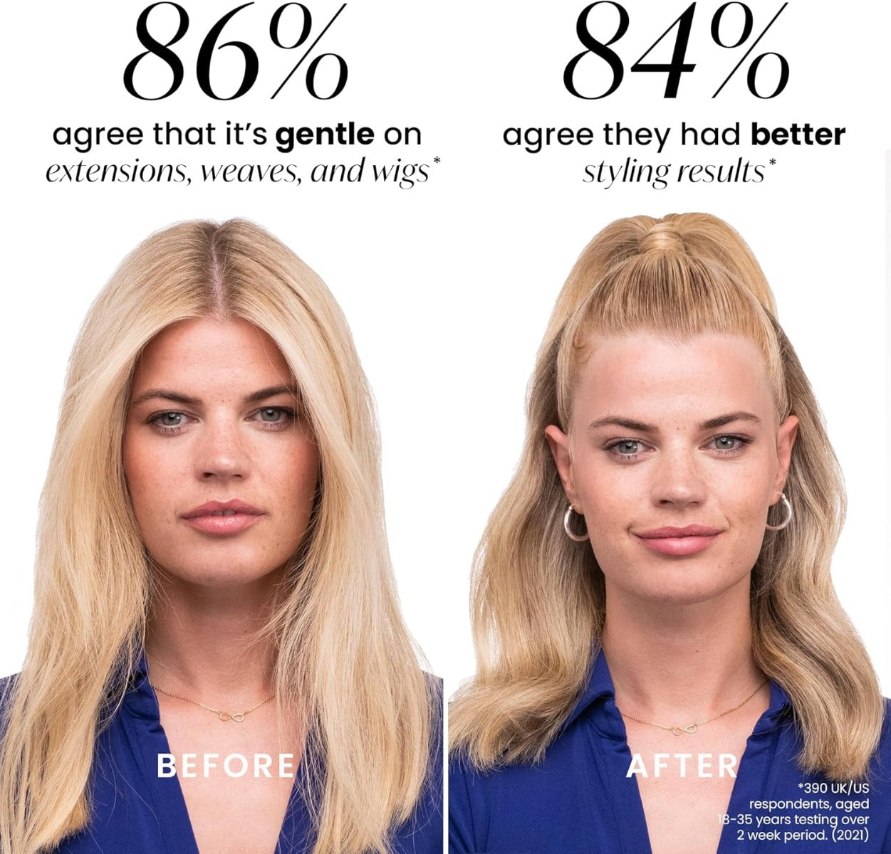 Our patented two-tired teeth have been adapted for effortless dry-styling, while our new and improved design gives you total control. The long teeth deliver precision but capturing every hair for updos, the shorter teeth smooth the cuticle for a high shine and the soft tips help blend extensions, clip-ins and weaves. *self-assessment of 390 women after 2 weeks of use