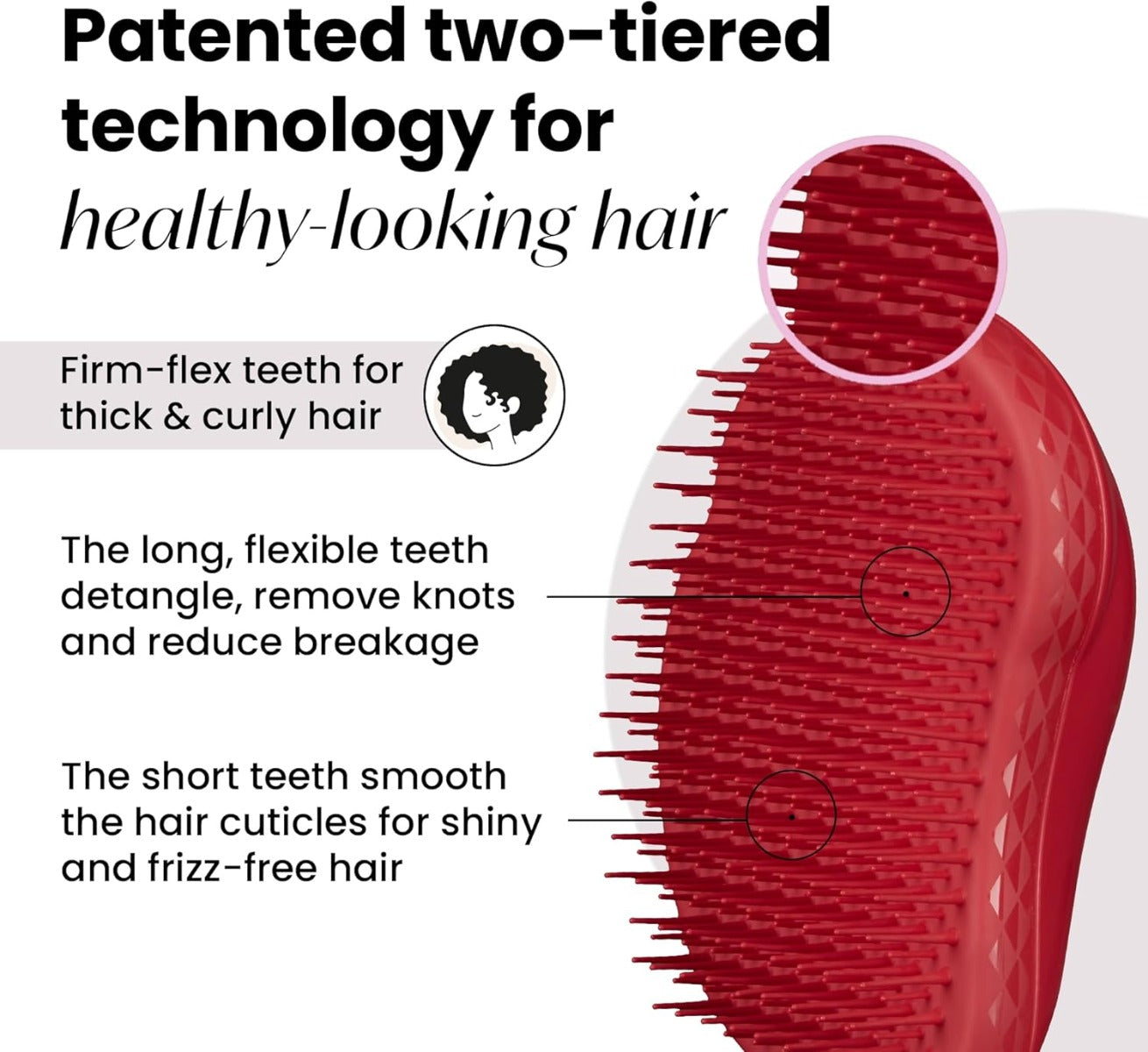 Our patented two-tiered firm-flex teeth have been adapted for thick and curly hair. The long, soft teeth detangle, removing knots and reducing breakage, while the short teeth smooth, for glossy, frizz-free hair.
