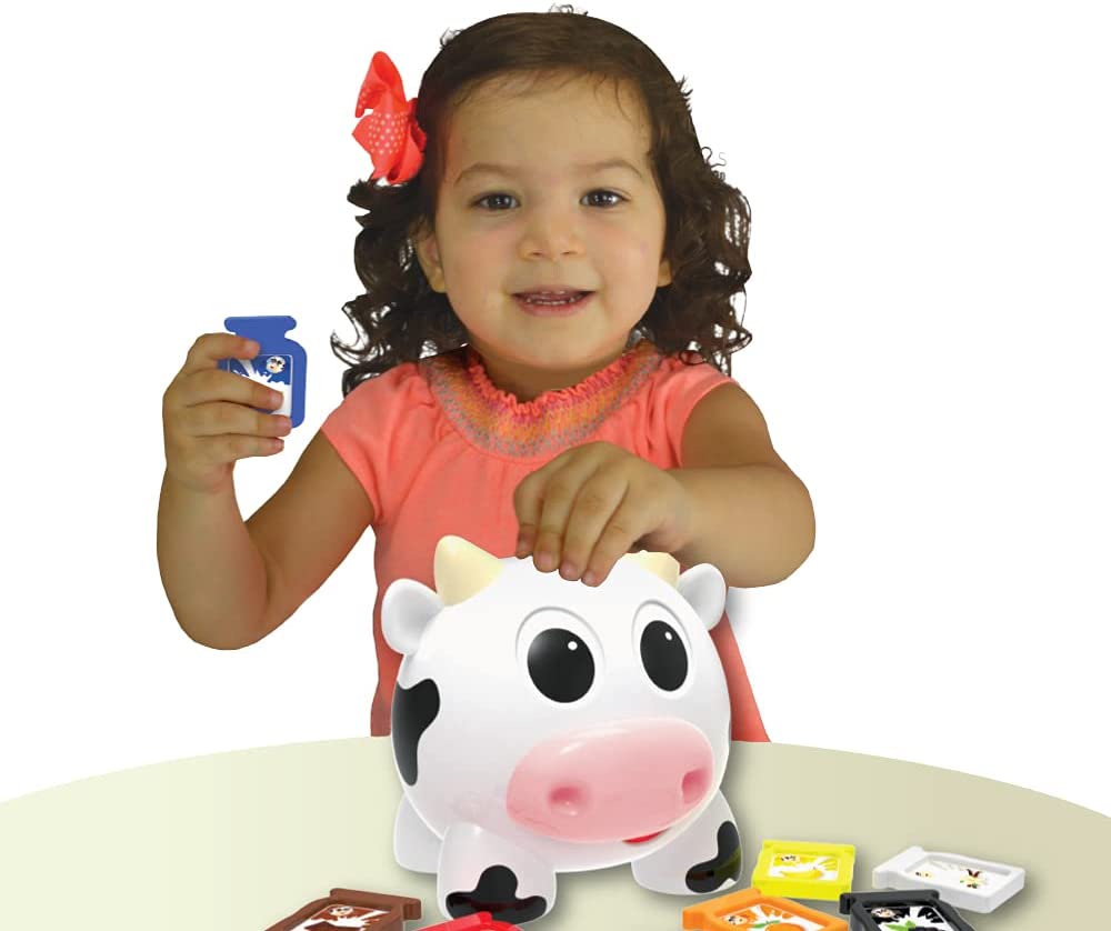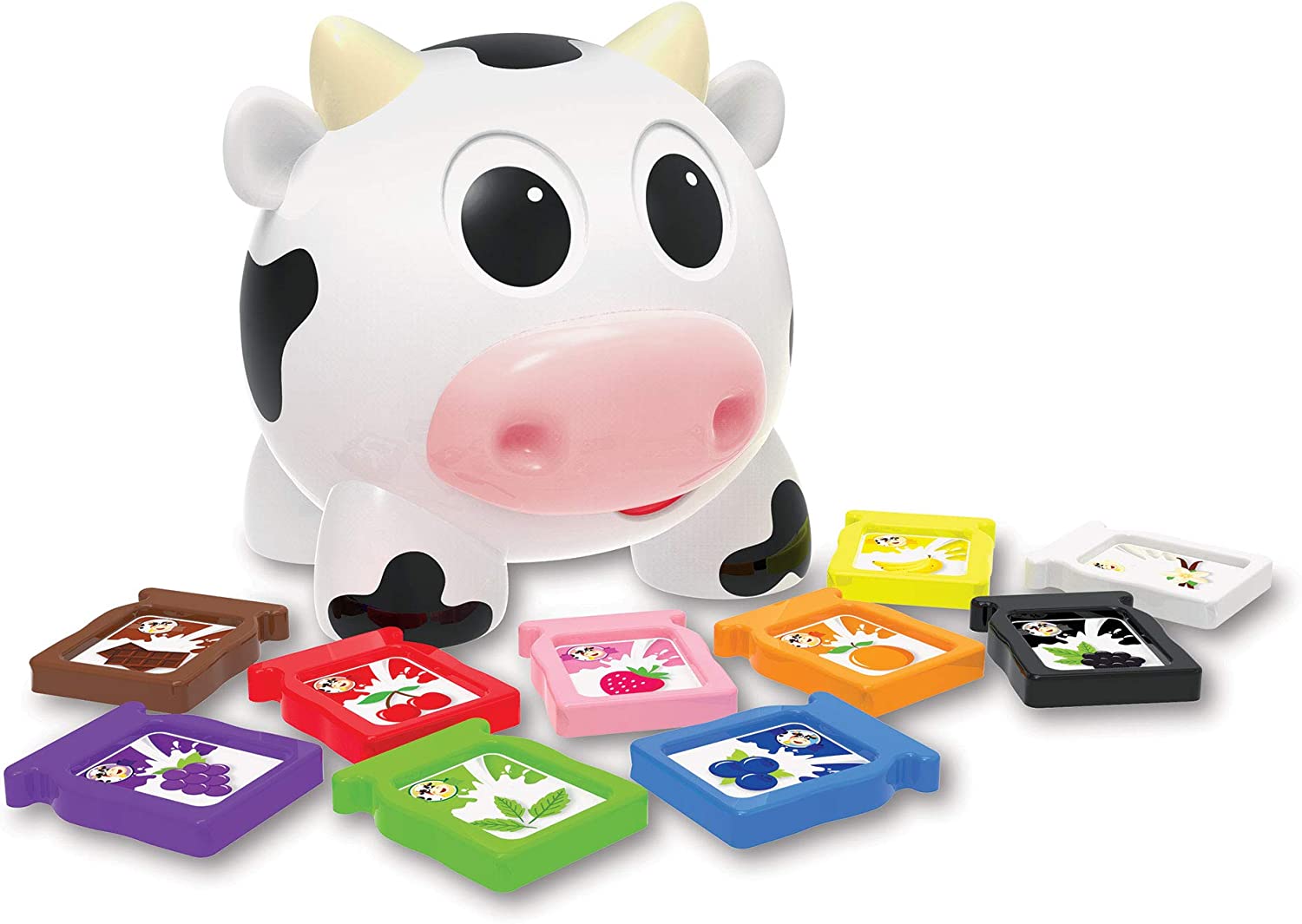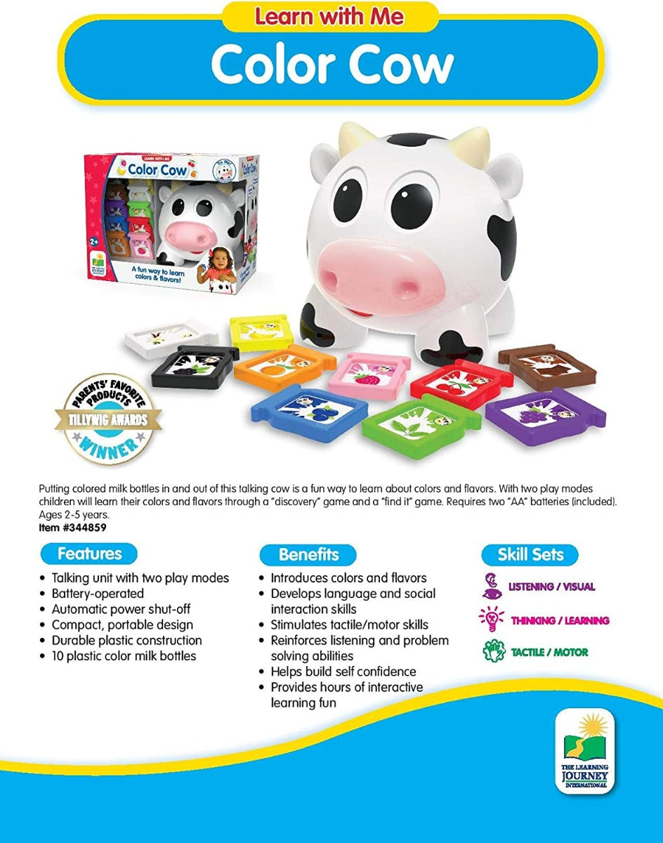 Learn With Me Color Cow comes with 10 milk bottles that feature multiple colors and flavors. Color Cow comes with 2 fun play modes - Discovery and find It! Discovery mode lets your little learner discover the different colors and flavors on their own. Find It! mode asks questions about various colors or flavors.