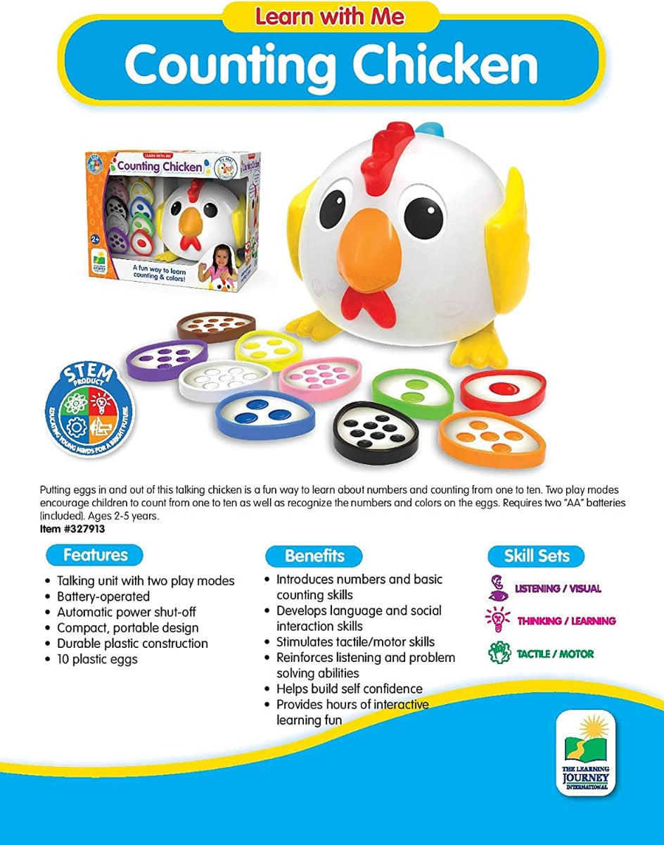 Counting Chicken comes with 10 numbered eggs. Learn With Me Counting Chicken comes with 2 fun play modes that encourage children to count from one to ten and to recognize the numbers on each egg.